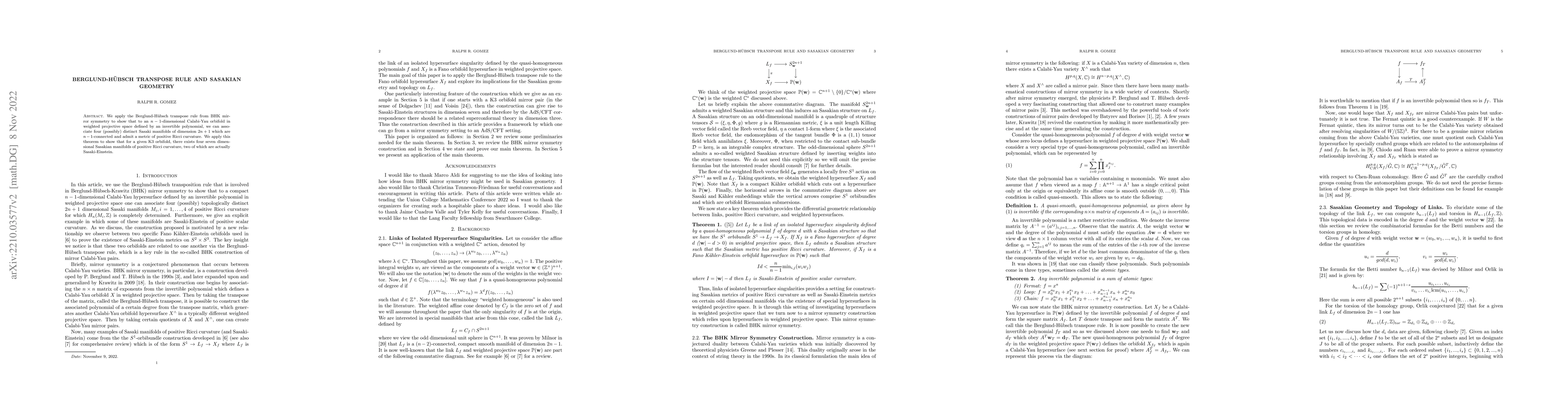 This paper applies the Berglund-Hübsch transpose rule from mirror symmetry to associate four distinct Sasakian manifolds with an $n-1$-dimensional Calabi-Yau orbifold, proving they are $n-1$-connected and have positive Ricci curvature. Specifically, for a K3 orbifold, it demonstrates the existence of four seven-dimensional Sasakian manifolds, two of which are Sasaki-Einstein.