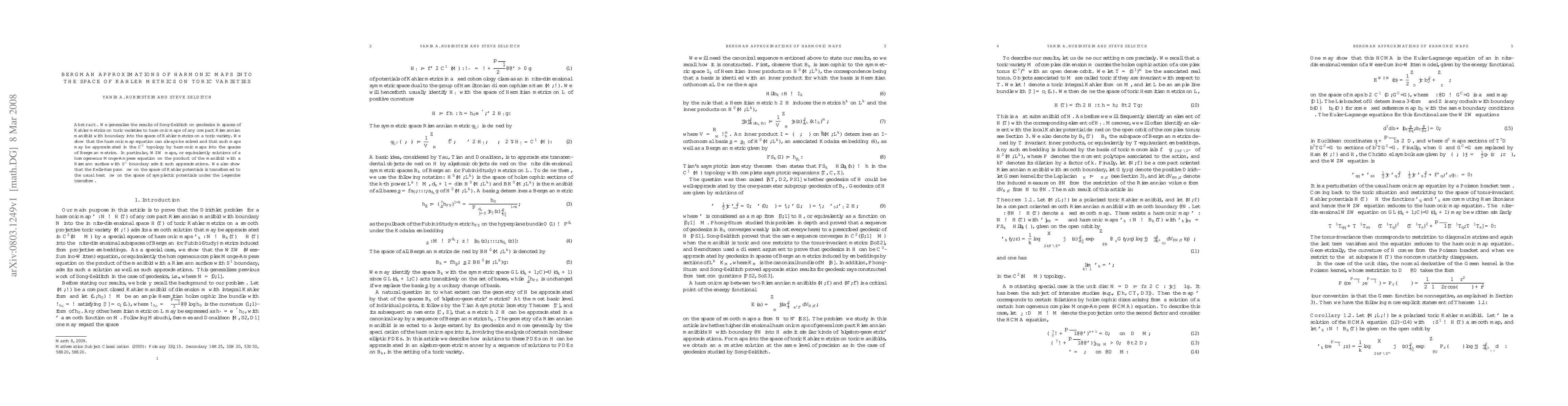 We generalize the results of Song-Zelditch on geodesics in spaces of Kahler metrics on toric varieties to harmonic maps of any compact Riemannian manifold with boundary into the space of Kahler metrics on a toric variety. We show that the harmonic map equation can always be solved and that such maps may be approximated in the C^2 topology by harmonic maps into the spaces of Bergman metrics. In particular, WZW maps, or equivalently solutions of a homogeneous Monge-Ampere equation on the product of the manifold with a Riemann surface with S^1 boundary admit such approximations. We also show that the Eells-Sampson flow on the space of Kahler potentials is transformed to the usual heat flow on the space of symplectic potentials under the Legendre transform.