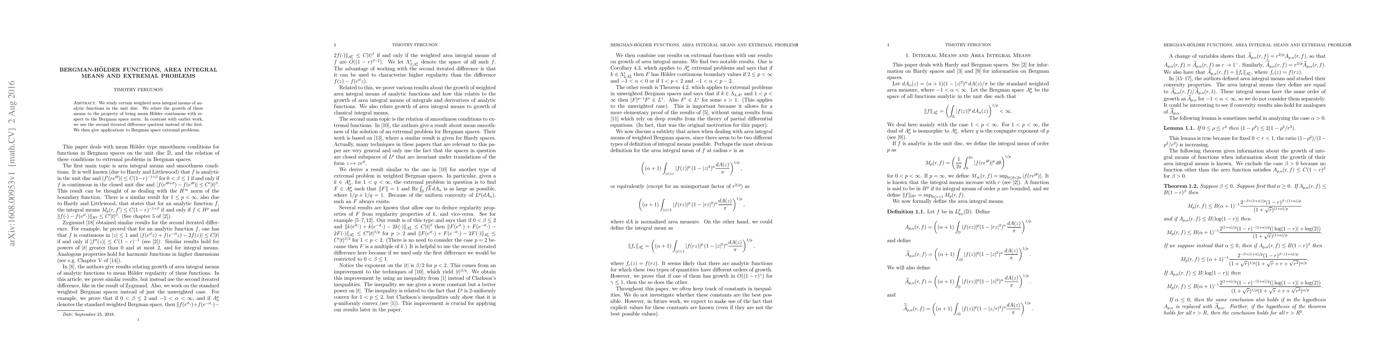This paper investigates weighted area integral means of analytic functions in the unit disc, linking their growth to mean H\"older continuity in the Bergman space norm using the second iterated difference quotient. It also applies these findings to solve extremal problems in Bergman space.