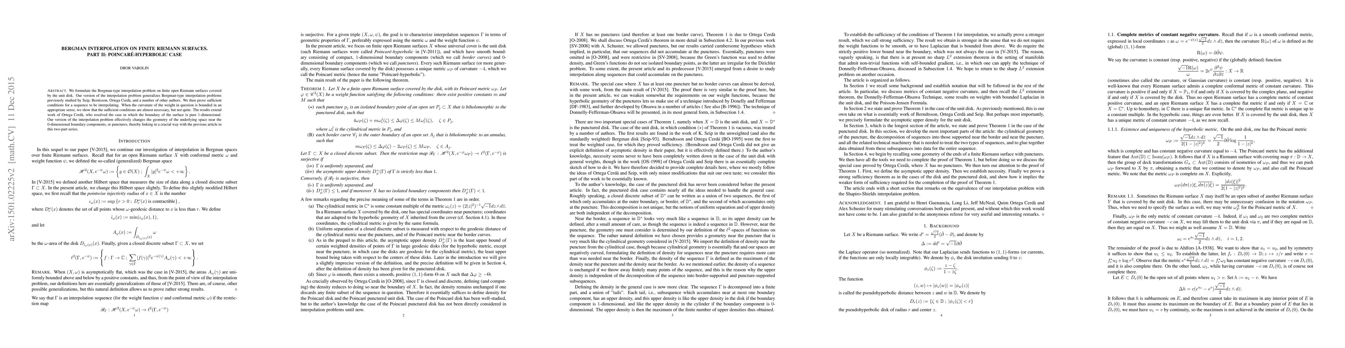We formulate the Bergman-type interpolation problem on finite open Riemann surfaces covered by the unit disk. Our version of the interpolation problem generalizes Bergman-type interpolation problems previously studied by Seip, Berntsson, Ortega Cerd\`a, and a number of other authors. We then prove necessary and sufficient conditions for interpolation, and also some sufficient conditions under even weaker hypotheses. The results extend work of Ortega Cerd\`a, who resolved the case in which the boundary of the surface is pure $1$-dimensional. Our version of the interpolation problem effectively changes the geometry of the underlying space near the punctures, thereby linking in a crucial way with the previous article in this two-part series.