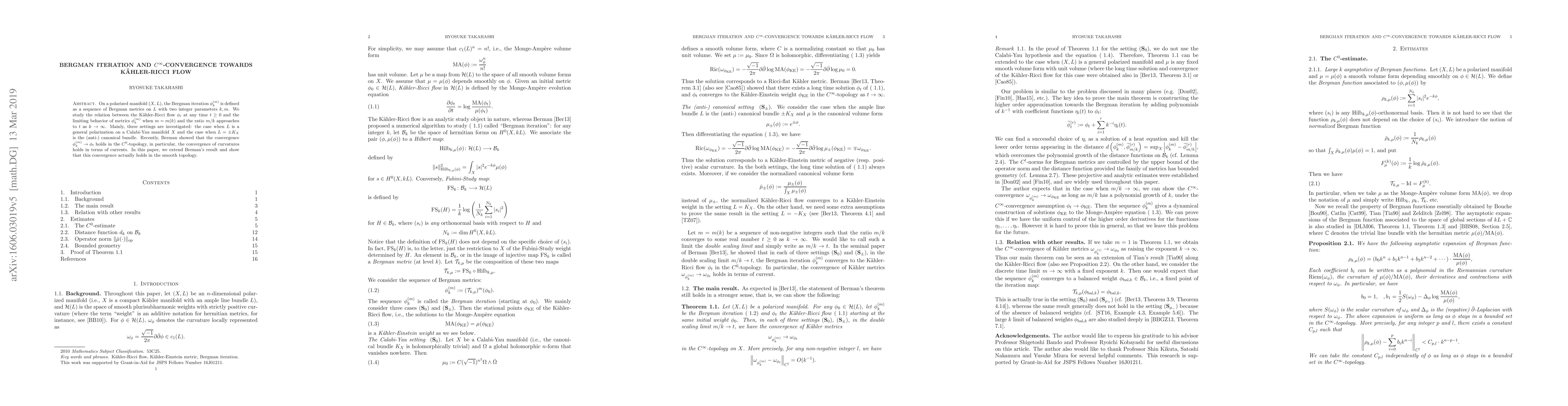 On a polarized manifold $(X,L)$, the Bergman iteration $\phi_k^{(m)}$ is defined as a sequence of Bergman metrics on $L$ with two integer parameters $k, m$. We study the relation between the K\"ahler-Ricci flow $\phi_t$ at any time $t \geq 0$ and the limiting behavior of metrics $\phi_k^{(m)}$ when $m=m(k)$ and the ratio $m/k$ approaches to $t$ as $k \to \infty$. Mainly, three settings are investigated: the case when $L$ is a general polarization on a Calabi-Yau manifold $X$ and the case when $L=\pm K_X$ is the (anti-) canonical bundle. Recently, Berman showed that the convergence $\phi_k^{(m)} \to \phi_t$ holds in the $C^0$-topology, in particular, the convergence of curvatures holds in terms of currents. In this paper, we extend Berman's result and show that this convergence actually holds in the smooth topology.