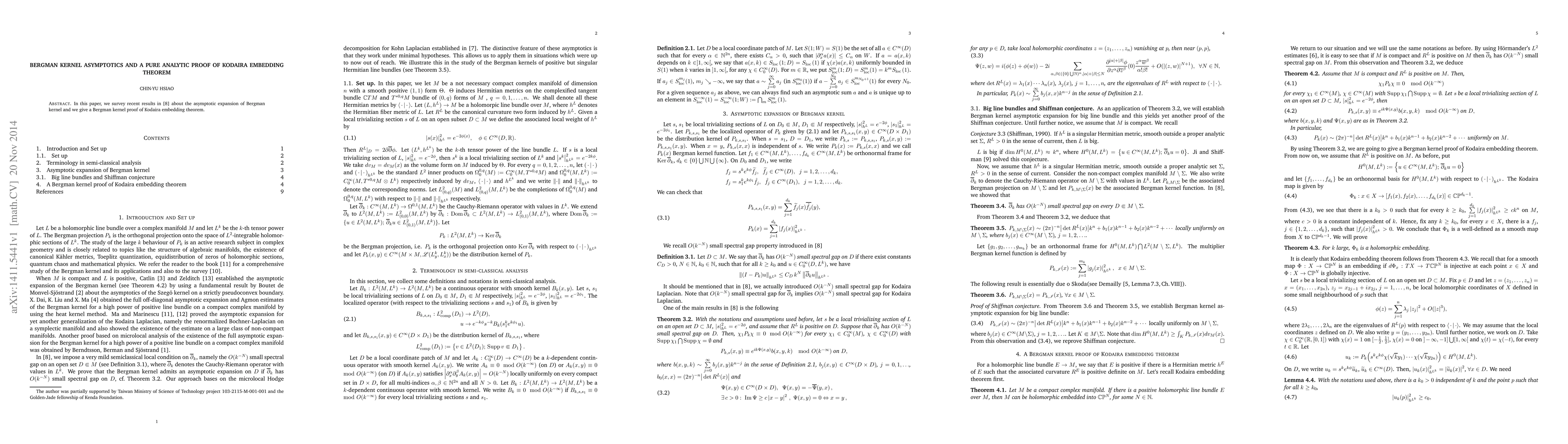 Summary: This paper surveys recent findings on the asymptotic expansion of the Bergman kernel and presents a novel pure analytic proof of the Kodaira embedding theorem using Bergman kernel techniques.