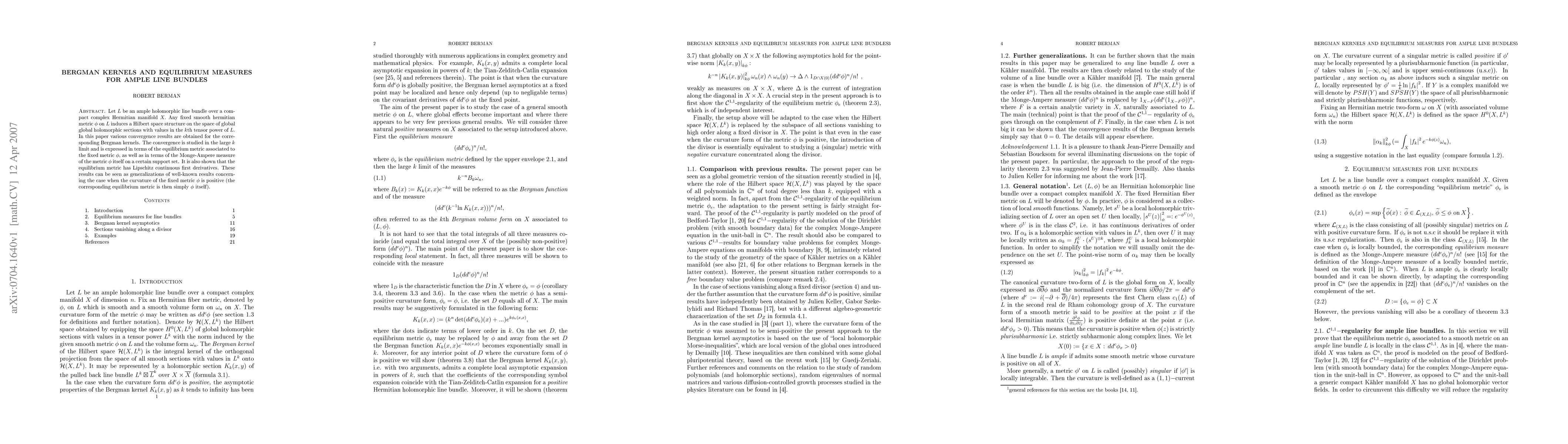 This paper studies convergence of Bergman kernels for ample line bundles over compact complex Hermitian manifolds, relating it to equilibrium metrics and Monge-Ampere measures.