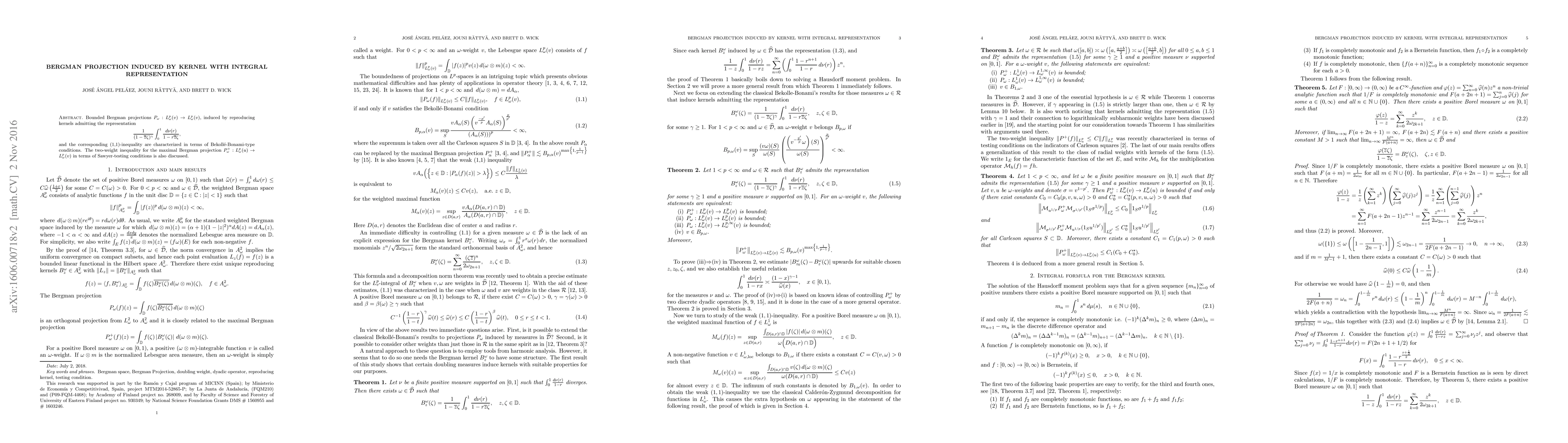 Bounded Bergman projections $P_\omega:L^p_\omega(v)\to L^p_\omega(v)$, induced by reproducing kernels admitting the representation $$ \frac{1}{(1-\overline{z}\zeta)^\gamma}\int_0^1\frac{d\nu(r)}{1-r\overline{z}\zeta}, $$ and the corresponding (1,1)-inequality are characterized in terms of Bekoll\'e-Bonami-type conditions. The two-weight inequality for the maximal Bergman projection $P^+_\omega:L^p_\omega(u)\to L^p_\omega(v)$ in terms of Sawyer-testing conditions is also discussed.