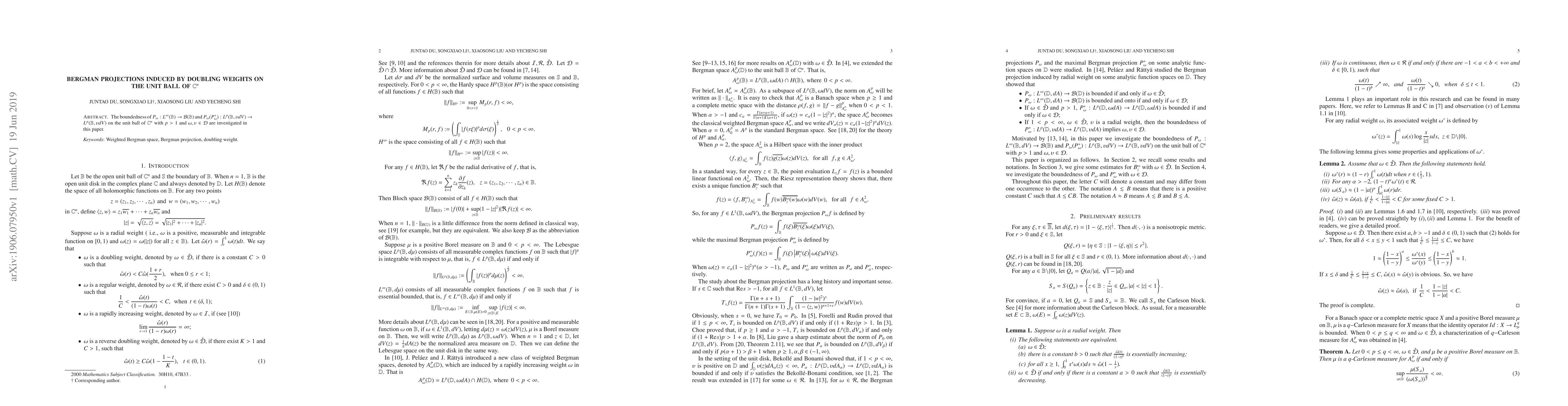 This paper examines the boundedness of Bergman projections $P_\omega$ and its adjoint $P_\omega^+$ on the unit ball of $\mathbb{C}^n$ for doubling weights $\omega$ and $\upsilon$, focusing on $L^p$ spaces for $p > 1$.