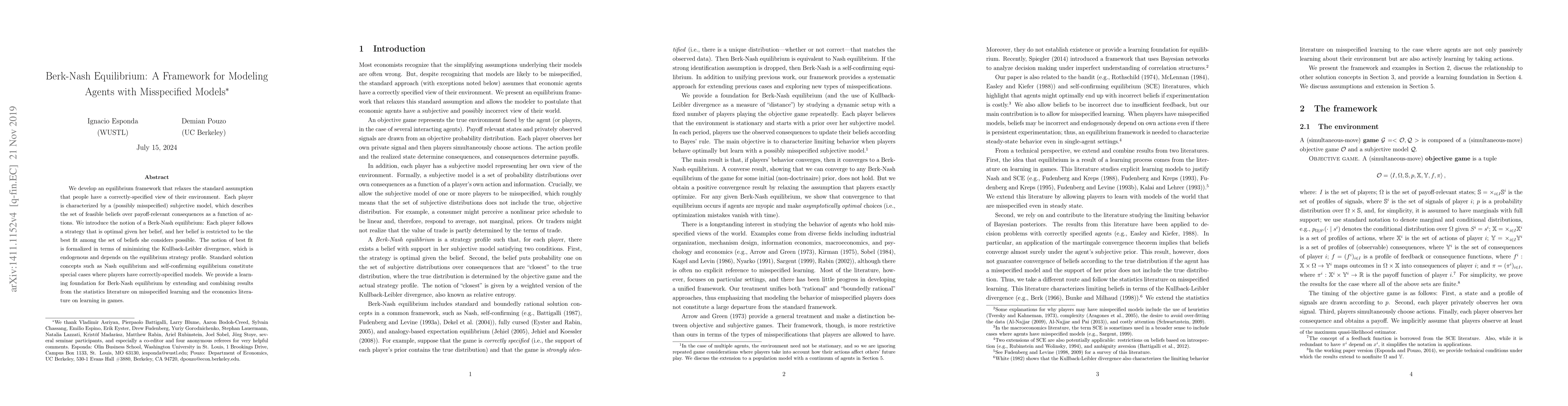 This paper introduces the Berk-Nash equilibrium framework to model agents with potentially misspecified models of their environment. It characterizes each player's strategy as optimal given their subjective model, with beliefs chosen to minimize Kullback-Leibler divergence relative to the equilibrium strategy profile.
