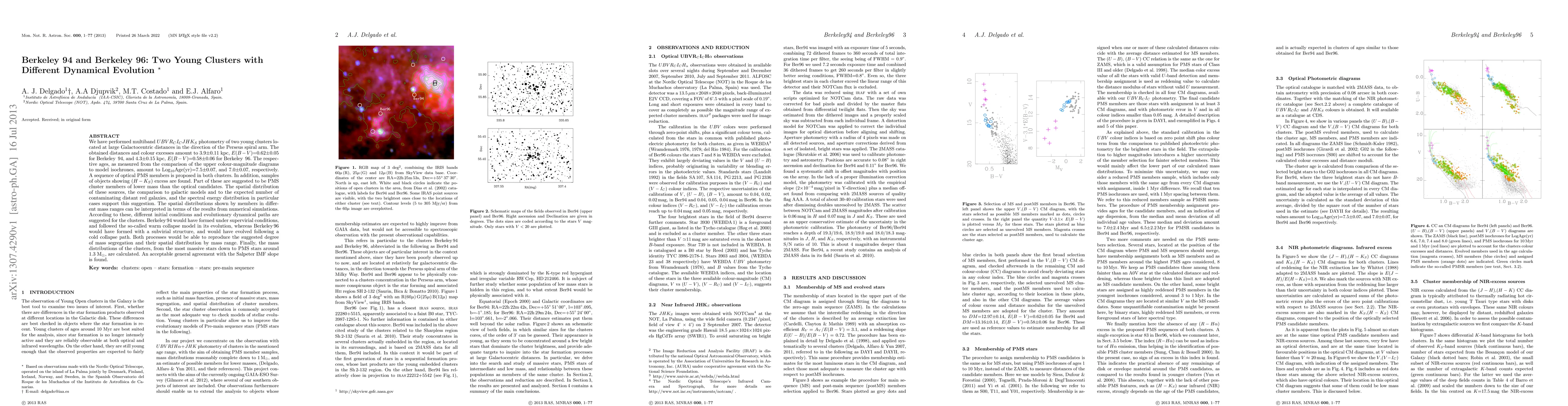 We have performed multiband UBVRcIcJHKs photometry of two young clusters located at large Galactocentric distances in the direction of the Perseus spiral arm. The obtained distances and colour excesses amount to 3.9+-0.11 kpc, E(B-V)=0.62+-0.05 for Berkeley 94, and 4.3+-0.15 kpc, E(B-V)=0.58+-0.06 for Berkeley 96. The respective ages, as measured from the comparison of the upper colour-magnitude diagrams to model isochrones, amount to LogAge(yr)=7.5+-0.07, and 7.0+-0.07, respectively. A sequence of optical PMS members is proposed in both clusters. In addition, samples of objects showing (H-Ks) excess are found. Part of these are suggested to be PMS cluster members of lower mass than the optical candidates. The spatial distribution of these sources, the comparison to galactic models and to the expected number of contaminating distant red galaxies, and the spectral energy distribution in particular cases support this suggestion. According to the results from numerical simulations, the spatial distributions of members in different mass ranges are interpreted as suggesting different initial conditions and evolutionary dynamical paths for the clusters. Berkeley 94 would have formed under supervirial conditions, and followed the so-called warm collapse model in its evolution, whereas Berkeley 96 would have formed with a subvirial structure, and would have evolved following a cold collapse path. Both processes would be able to reproduce the suggested degree of mass segregation and their spatial distribution by mass range. Finally, the mass distributions of the clusters, from the most massive stars down to PMS stars around 1.3 Msun, are calculated. An acceptable general agreement with the Salpeter IMF slope is found.