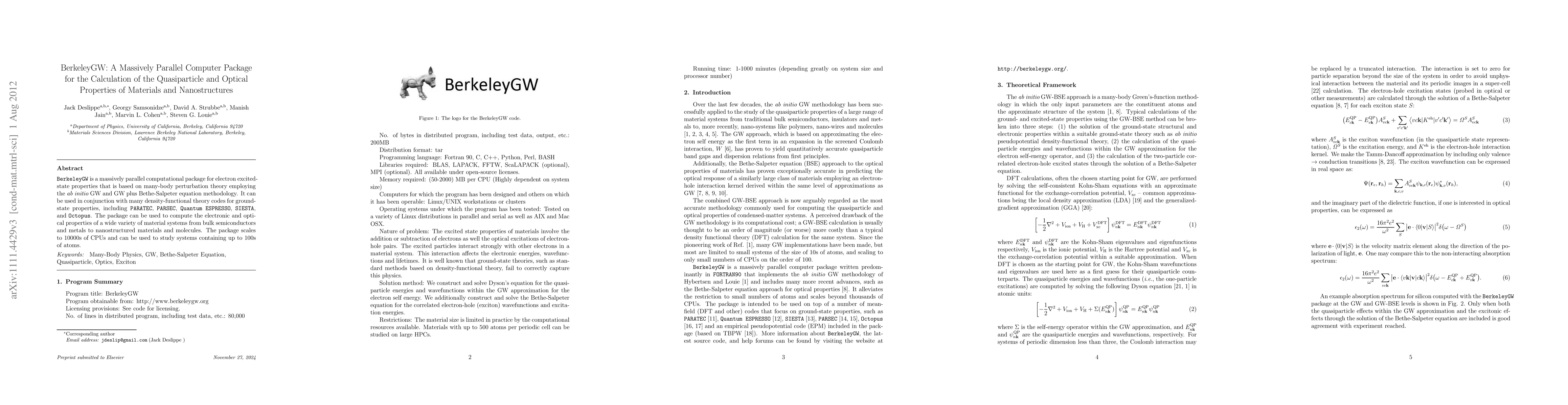 BerkeleyGW is a high-performance parallel computational package for calculating quasiparticle and optical properties of materials using ab initio GW and Bethe-Salpeter methodologies. It scales to thousands of CPUs and supports a range of DFT codes for ground-state calculations.