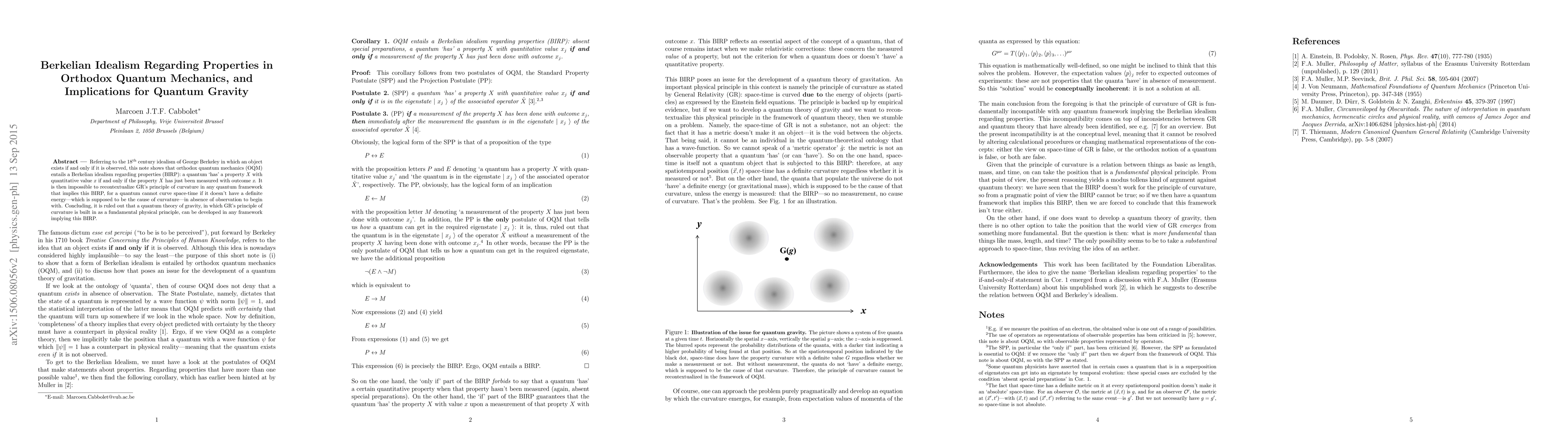 Referring to the 18th century idealism of George Berkeley in which an object exists if and only if it is observed, this note shows that orthodox quantum mechanics (OQM) entails a Berkelian idealism regarding properties (BIRP): a quantum `has' a property X with quantitative value x if and only if the property X has just been measured with outcome x. It is then impossible to recontextualize GR's principle of curvature in any quantum framework that implies this BIRP, for a quantum cannot curve space-time if it doesn't have a definite energy - which is supposed to be the cause of curvature - in absence of observation to begin with. Concluding, it is ruled out that a quantum theory of gravity, in which GR's principle of curvature is built in as a fundamental physical principle, can be developed in any framework implying this BIRP.