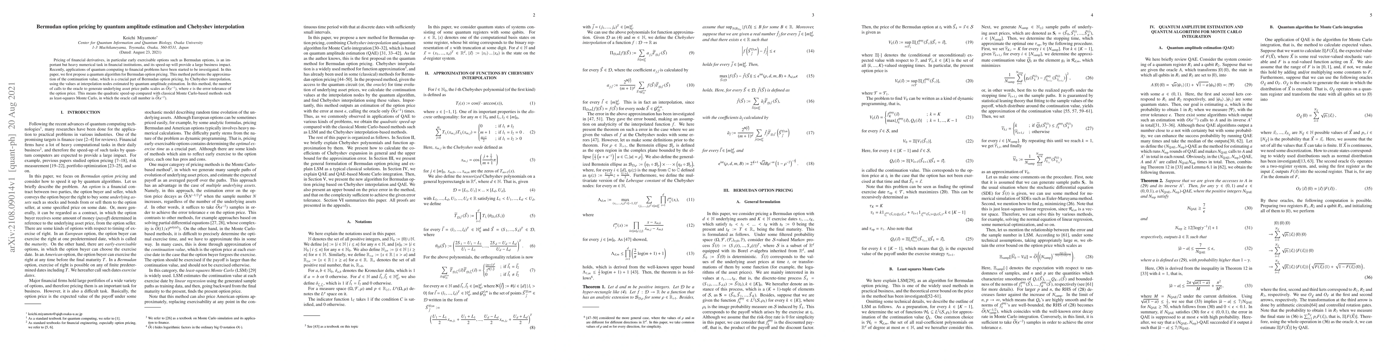 This paper proposes a quantum algorithm for Bermudan option pricing that uses quantum amplitude estimation and Chebyshev interpolation to approximate the continuation value, achieving a quadratic speed-up over classical Monte Carlo methods. The algorithm scales the oracle call number as $\widetilde{O}(\epsilon^{-1})$ with error tolerance $\epsilon$.