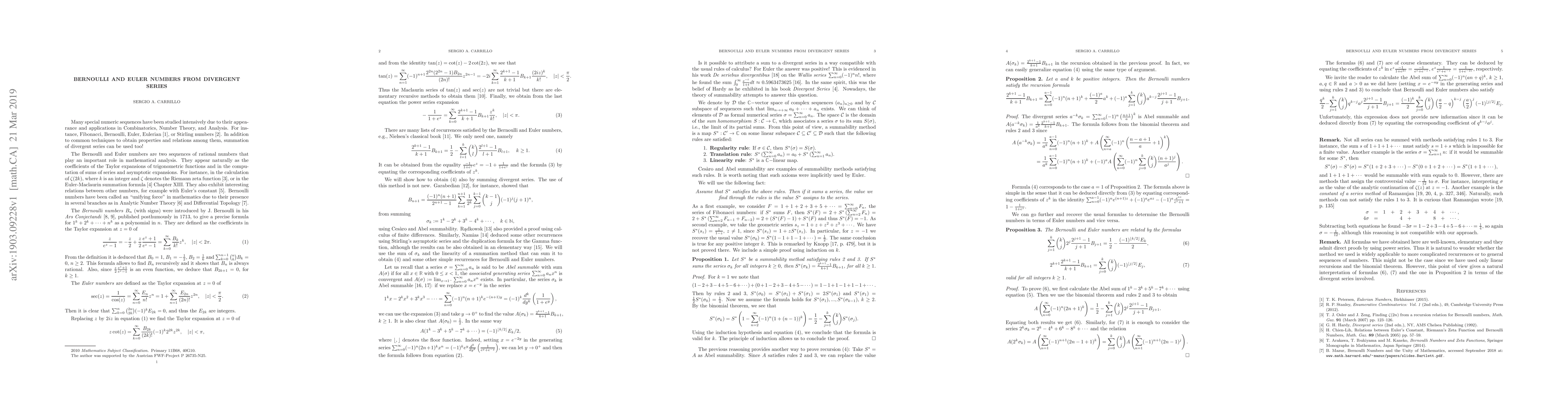 This paper presents a straightforward proof of identities and recurrences for Bernoulli and Euler numbers using the Abel sum of the divergent series, emphasizing the role of the summation method's linearity in determining their numerical values.