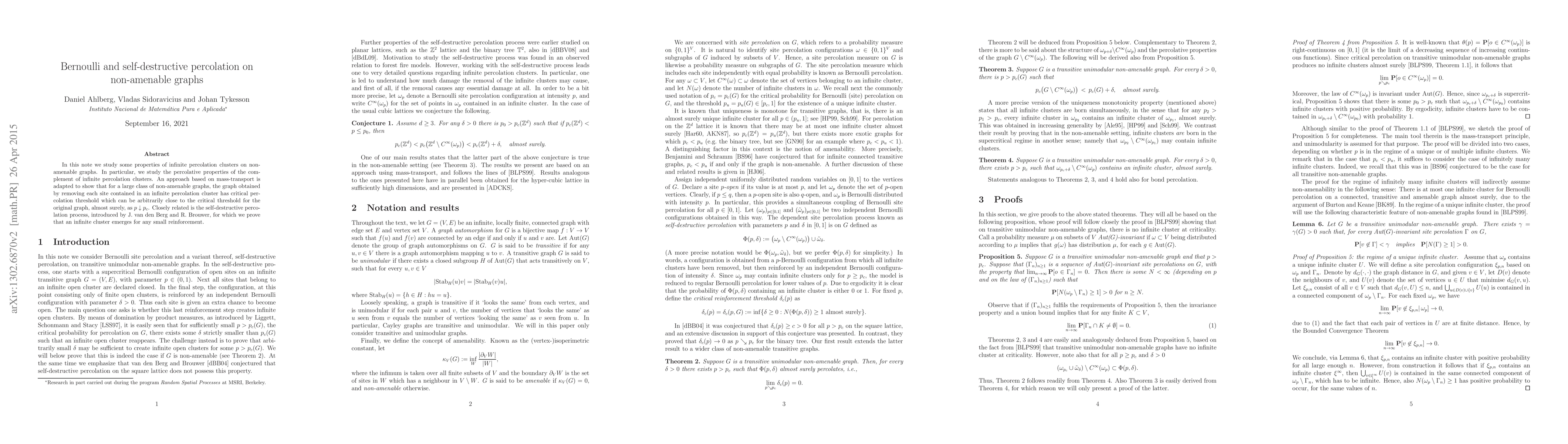 In this note we study some properties of infinite percolation clusters on non-amenable graphs. In particular, we study the percolative properties of the complement of infinite percolation clusters. An approach based on mass-transport is adapted to show that for a large class of non-amenable graphs, the graph obtained by removing each site contained in an infinite percolation cluster has critical percolation threshold which can be arbitrarily close to the critical threshold for the original graph, almost surely, as p approaches p_c. Closely related is the self-destructive percolation process, introduced by J. van den Berg and R. Brouwer, for which we prove that an infinite cluster emerges for any small reinforcement.