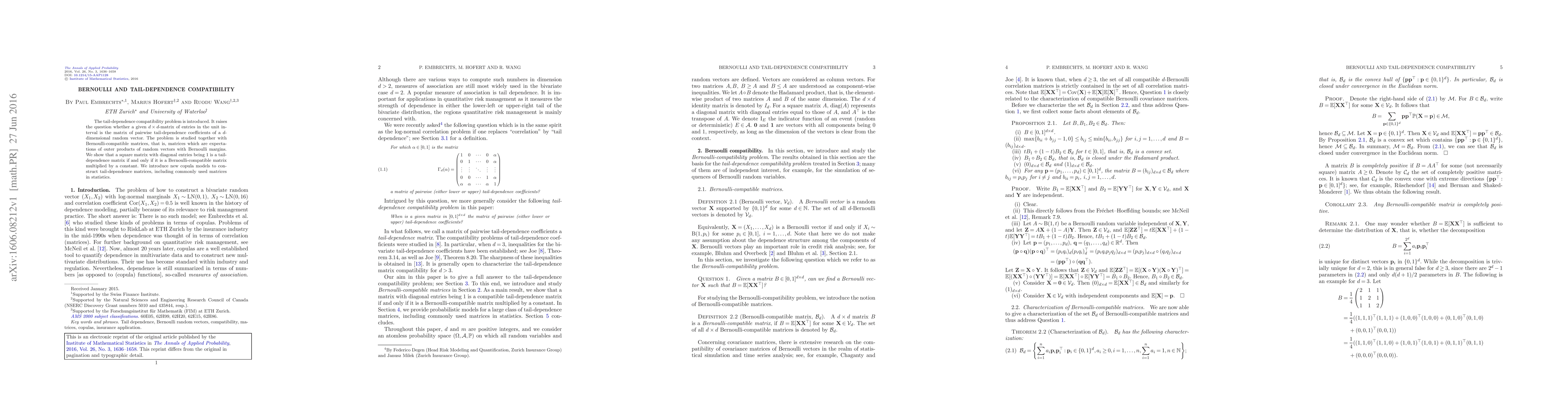 The tail-dependence compatibility problem is introduced. It raises the question whether a given $d\times d$-matrix of entries in the unit interval is the matrix of pairwise tail-dependence coefficients of a $d$-dimensional random vector. The problem is studied together with Bernoulli-compatible matrices, that is, matrices which are expectations of outer products of random vectors with Bernoulli margins. We show that a square matrix with diagonal entries being 1 is a tail-dependence matrix if and only if it is a Bernoulli-compatible matrix multiplied by a constant. We introduce new copula models to construct tail-dependence matrices, including commonly used matrices in statistics.