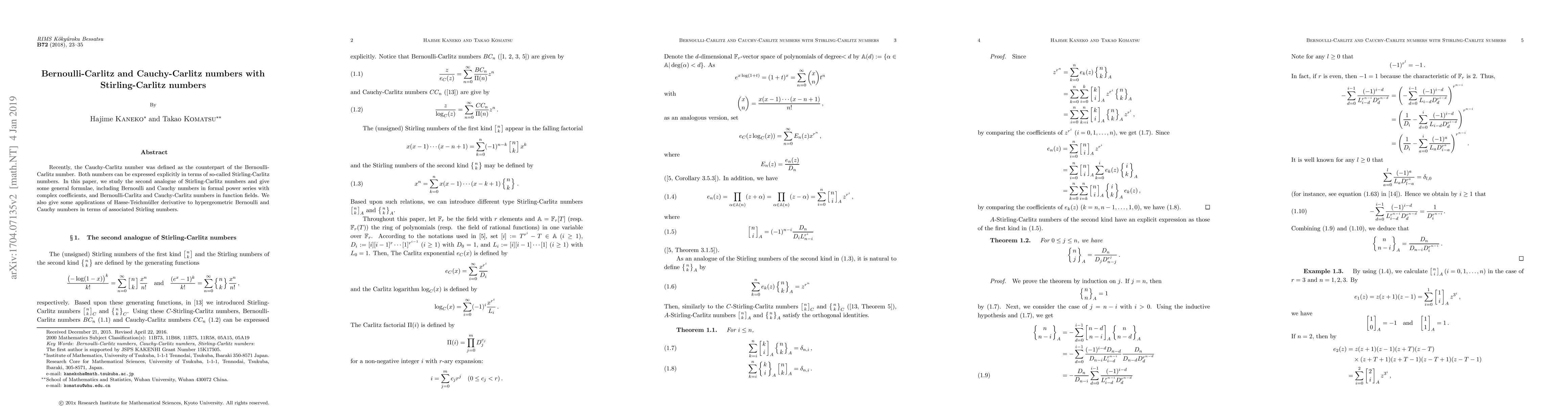 Recently, the Cauchy-Carlitz number was defined as the counterpart of the Bernoulli-Carlitz number. Both numbers can be expressed explicitly in terms of so-called Stirling-Carlitz numbers. In this paper, we study the second analogue of Stirling-Carlitz numbers and give some general formulae, including Bernoulli and Cauchy numbers in formal power series with complex coefficients, and Bernoulli-Carlitz and Cauchy-Carlitz numbers in function fields. We also give some applications of Hasse-Teichm\"uller derivative to hypergeometric Bernoulli and Cauchy numbers in terms of associated Stirling numbers.