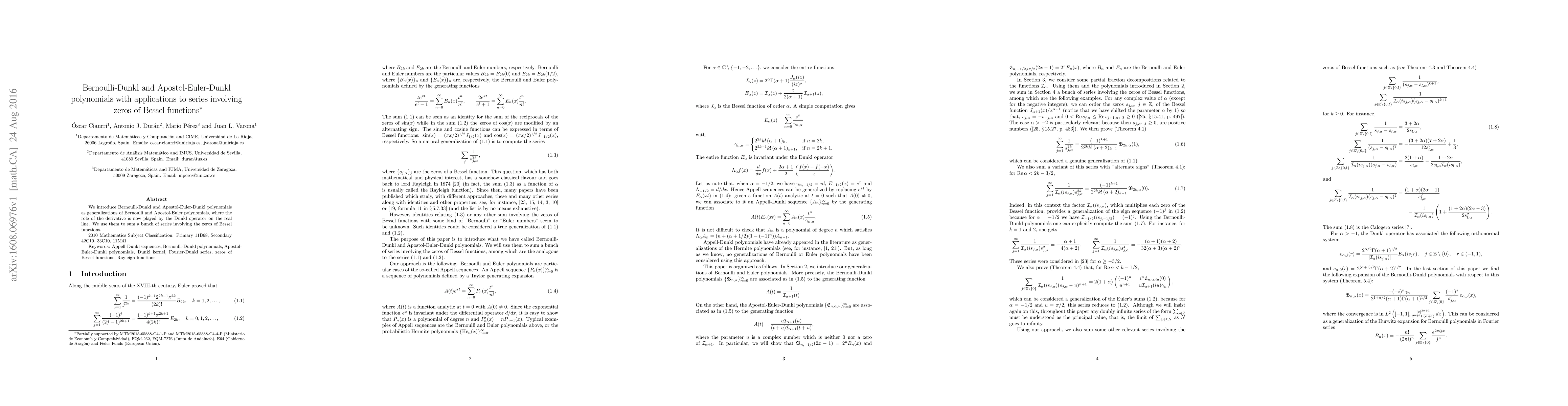 Summary: This paper introduces Bernoulli-Dunkl and Apostol-Euler-Dunkl polynomials as generalizations that utilize the Dunkl operator. These polynomials are applied to derive summations for series linked to the zeros of Bessel functions.