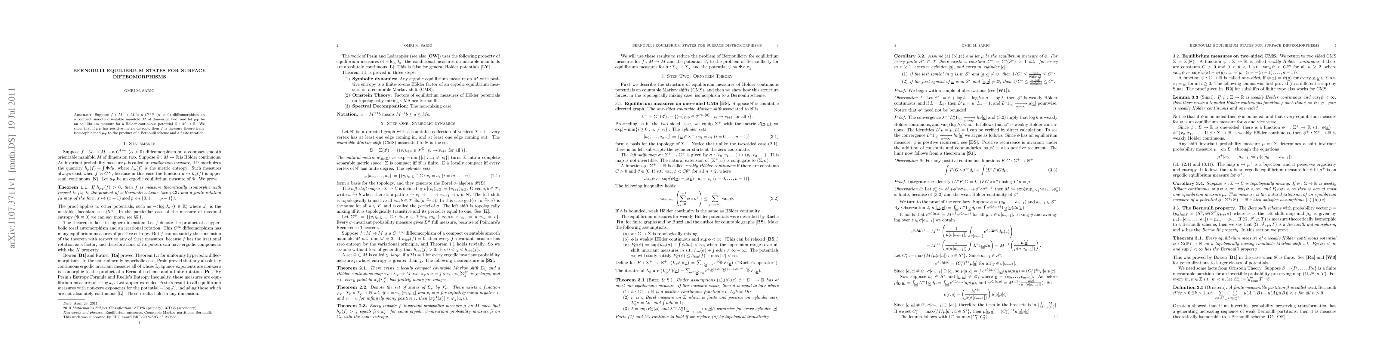 Researchers show that a certain type of surface diffeomorphism is measure theoretically isomorphic to a Bernoulli scheme and a finite rotation if it has an equilibrium measure with positive metric entropy.