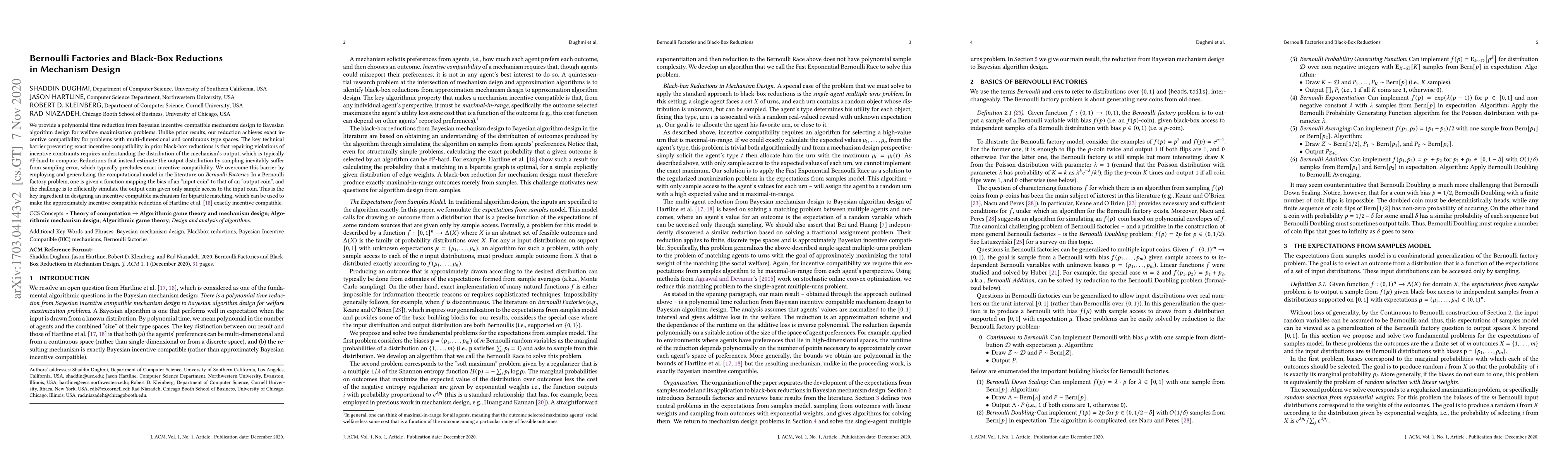 We provide a polynomial time reduction from Bayesian incentive compatible mechanism design to Bayesian algorithm design for welfare maximization problems. Unlike prior results, our reduction achieves exact incentive compatibility for problems with multi-dimensional and continuous type spaces. The key technical barrier preventing exact incentive compatibility in prior black-box reductions is that repairing violations of incentive constraints requires understanding the distribution of the mechanism's output, which is typically #P-hard to compute. Reductions that instead estimate the output distribution by sampling inevitably suffer from sampling error, which typically precludes exact incentive compatibility. We overcome this barrier by employing and generalizing the computational model in the literature on $\textit{Bernoulli factories}$. In a Bernoulli factory problem, one is given a function mapping the bias of an "input coin" to that of an "output coin", and the challenge is to efficiently simulate the output coin given only sample access to the input coin. This is the key ingredient in designing an incentive compatible mechanism for bipartite matching, which can be used to make the approximately incentive compatible reduction of Hartline et al. (2015) exactly incentive compatible.