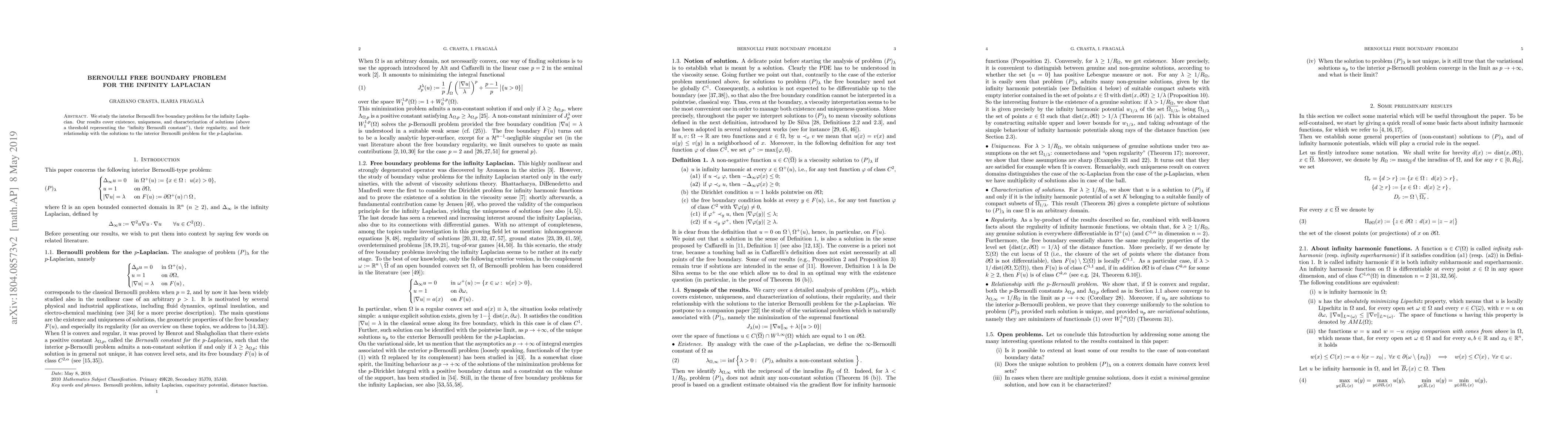 This paper explores the interior Bernoulli free boundary problem for the infinity Laplacian, proving existence, uniqueness, and characterization of solutions above a threshold, along with their regularity and connections to $p$-Laplacian solutions.