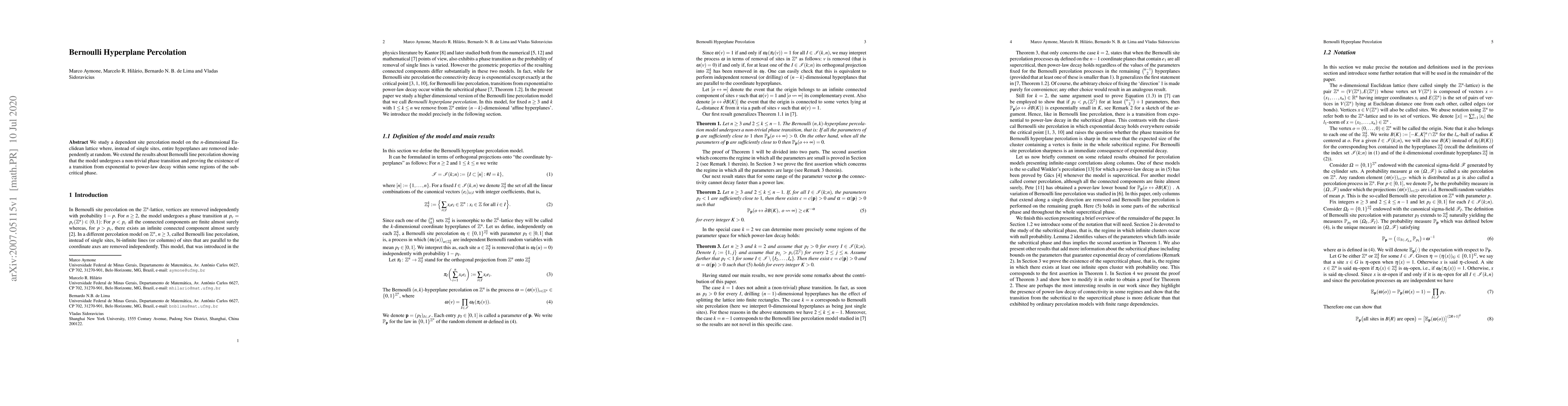 We study a dependent site percolation model on the $n$-dimensional Euclidean lattice where, instead of single sites, entire hyperplanes are removed independently at random. We extend the results about Bernoulli line percolation showing that the model undergoes a non-trivial phase transition and proving the existence of a transition from exponential to power-law decay within some regions of the subcritical phase.