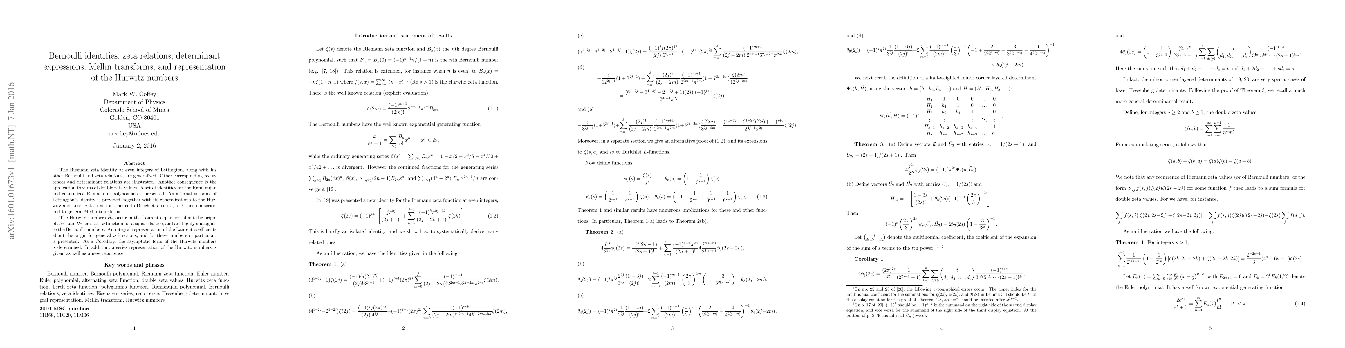 The Riemann zeta identity at even integers of Lettington, along with his other Bernoulli and zeta relations, are generalized. Other corresponding recurrences and determinant relations are illustrated. Another consequence is the application to sums of double zeta values. A set of identities for the Ramanujan and generalized Ramanujan polynomials is presented. An alternative proof of Lettington's identity is provided, together with its generalizations to the Hurwitz and Lerch zeta functions, hence to Dirichlet $L$ series, to Eisenstein series, and to general Mellin transforms. The Hurwitz numbers $\tilde{H}_n$ occur in the Laurent expansion about the origin of a certain Weierstrass $\wp$ function for a square lattice, and are highly analogous to the Bernoulli numbers. An integral representation of the Laurent coefficients about the origin for general $\wp$ functions, and for these numbers in particular, is presented. As a Corollary, the asymptotic form of the Hurwitz numbers is determined. In addition, a series representation of the Hurwitz numbers is given, as well as a new recurrence.