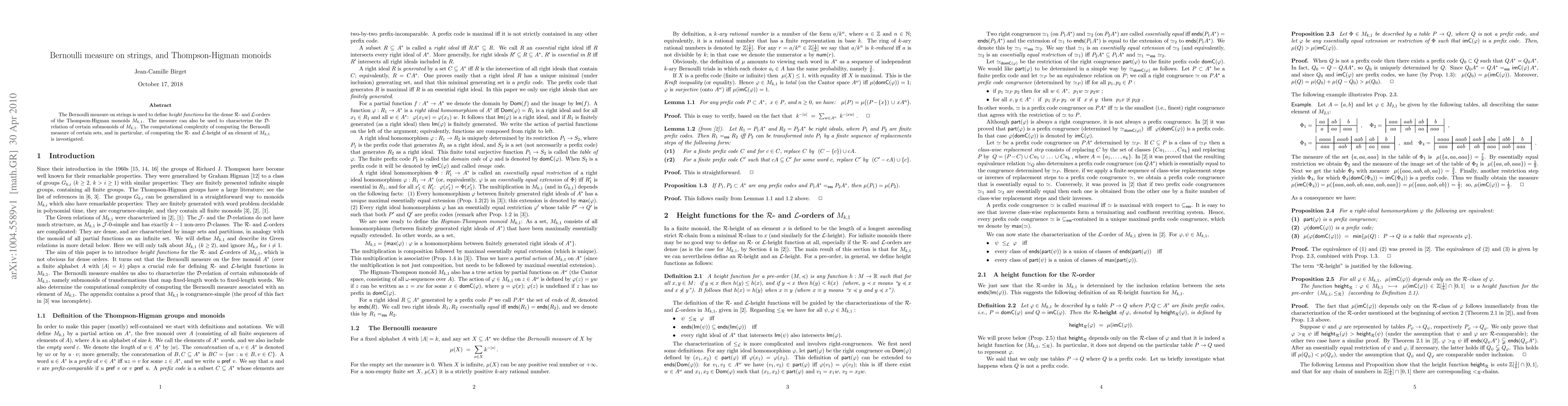 The Bernoulli measure on strings is used to define height functions for the dense R- and L-orders of the Thompson-Higman monoids M_{k,1}. The measure can also be used to characterize the D-relation of certain submonoids of M_{k,1}. The computational complexity of computing the Bernoulli measure of certain sets, and in particular, of computing the R- and L-height of an element of M_{k,1} is investigated.