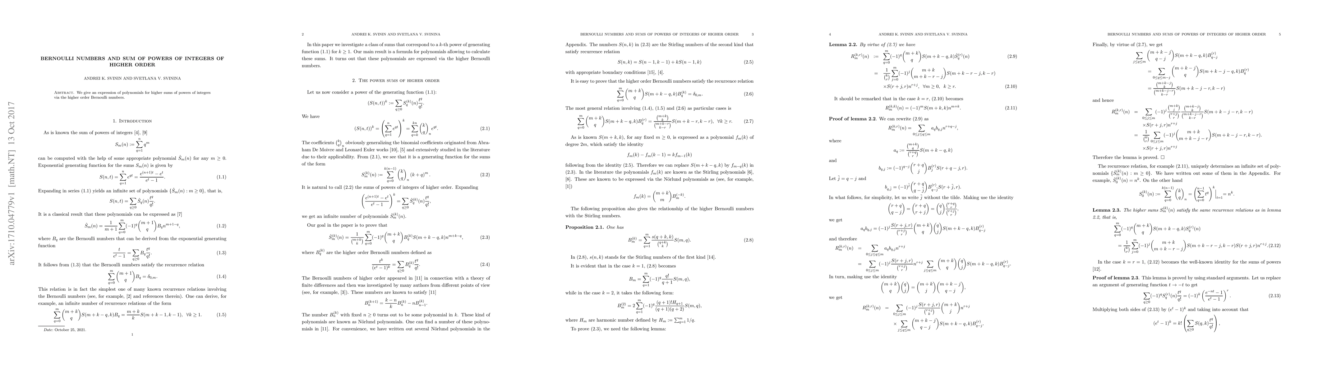 Summary: This paper presents a polynomial expression for higher-order sums of powers of integers using higher-order Bernoulli numbers. The results provide a new method to compute these sums efficiently.
