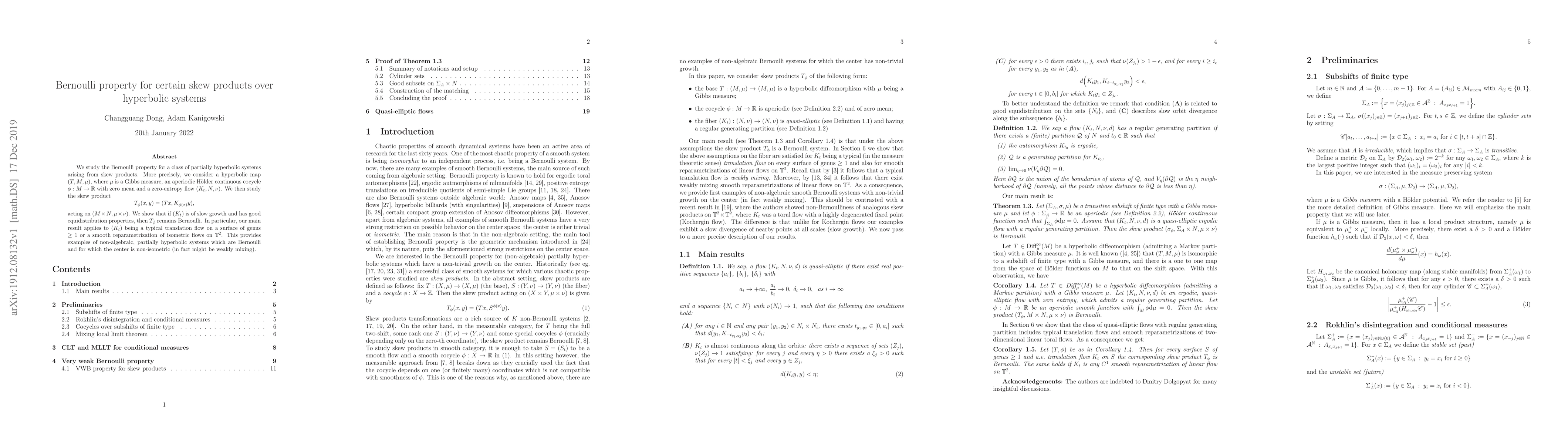 This paper investigates the Bernoulli property in a class of skew products derived from hyperbolic systems, demonstrating that certain translation flows and reparametrizations of isometric flows on surfaces maintain this property under specific conditions. The study focuses on systems with good equidistribution and slow growth.