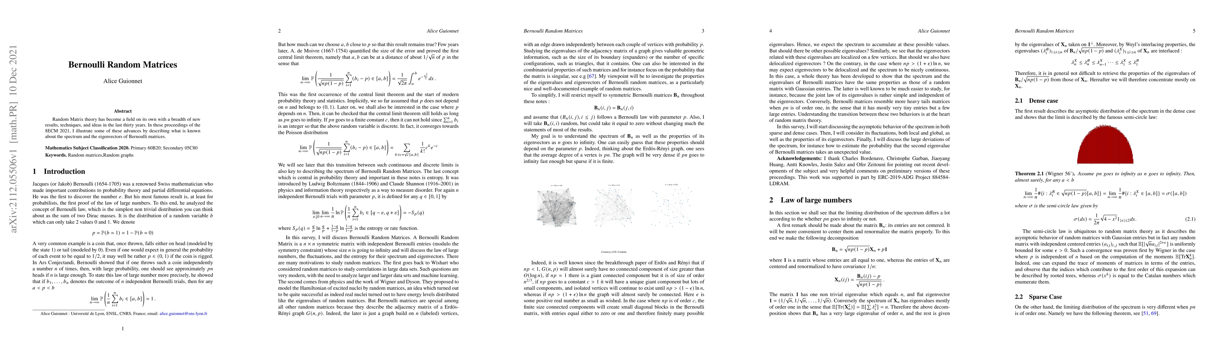 Summary: This paper reviews recent advancements in Random Matrix theory, focusing on the spectral properties and eigenvectors of Bernoulli matrices, a specific class of random matrices. It highlights new findings and techniques developed over the past three decades.