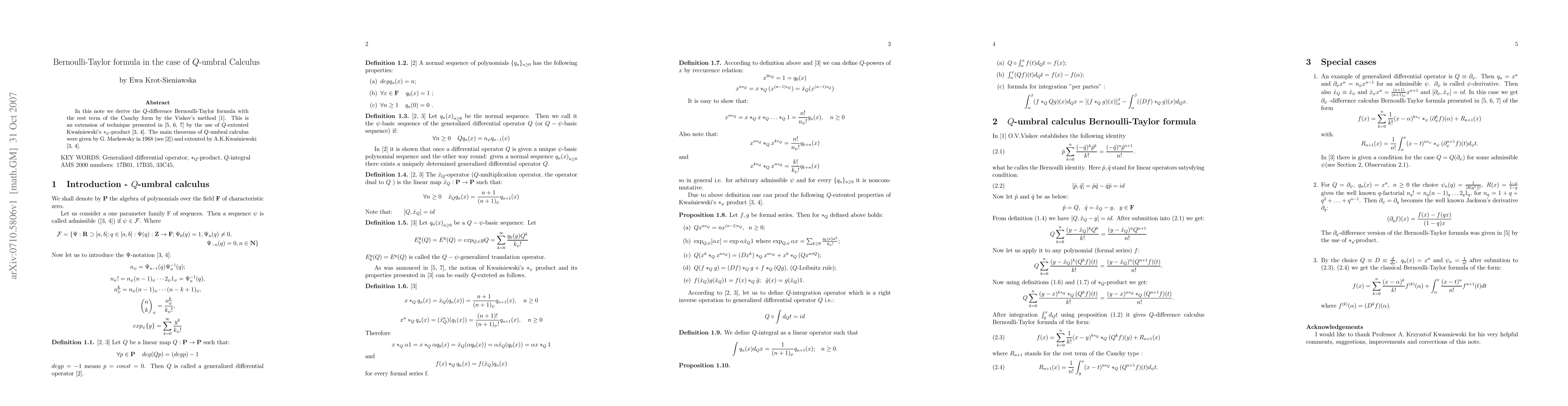 In this note we derive the Q-difference Bernoulli-Taylor formula with the rest term of the Cauchy form by the Viskov's method. This is an extension of technique by the use of Q-extented Kwasniewski's *-product . The main theorems of Q-umbral calculus were given by G. Markowsky in 1968 and extented by A.K.Kwasniewski.