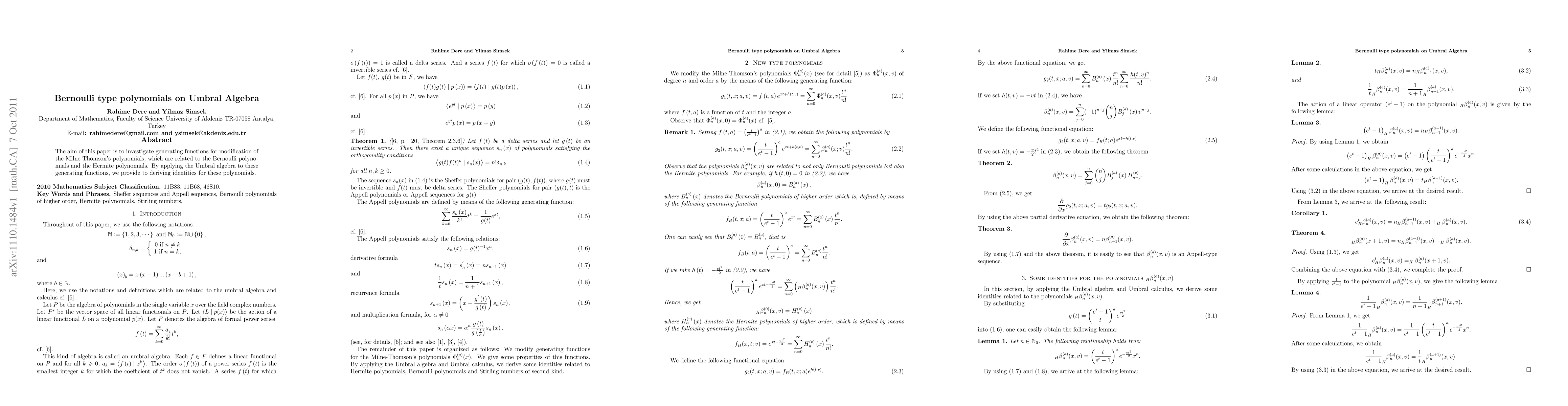 The aim of this paper is to investigate generating functions for modification of the Milne-Thomson's polynomials, which are related to the Bernoulli polynomials and the Hermite polynomials. By applying the Umbral algebra to these generating functions, we provide to deriving identities for these polynomials.