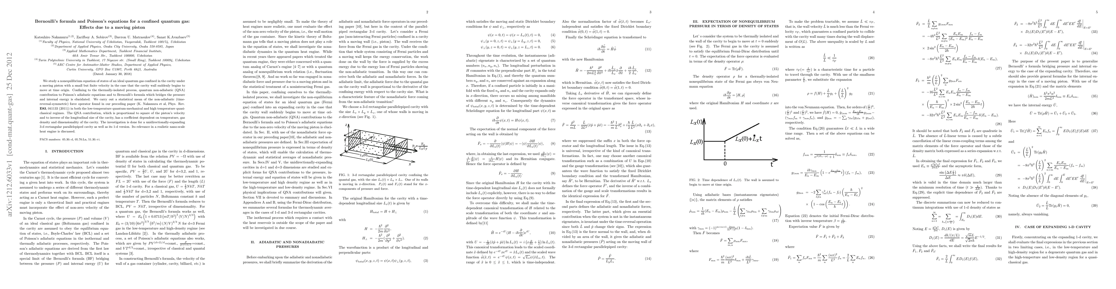 We study a nonequilibrium equation of states of an ideal quantum gas confined in the cavity under a moving piston with a small but finite velocity in the case that the cavity wall suddenly begins to move at time origin. Confining to the thermally-isolated process, quantum non-adiabatic (QNA) contribution to Poisson's adiabatic equations and to Bernoulli's formula which bridges the pressure and internal energy is elucidated. We carry out a statistical mean of the non-adiabatic (time-reversal-symmetric) force operator found in our preceding paper (K. Nakamura et al, Phys. Rev. E Vol.83, 041133, (2011)) in both the low-temperature quantum-mechanical and high temperature quasi-classical regimes. The QNA contribution, which is proportional to square of the piston's velocity and to inverse of the longitudinal size of the cavity, has a coefficient dependent on temperature, gas density and dimensionality of the cavity. The investigation is done for a unidirectionally-expanding 3-d rectangular parallelepiped cavity as well as its 1-d version. Its relevance in a realistic nano-scale heat engine is discussed.