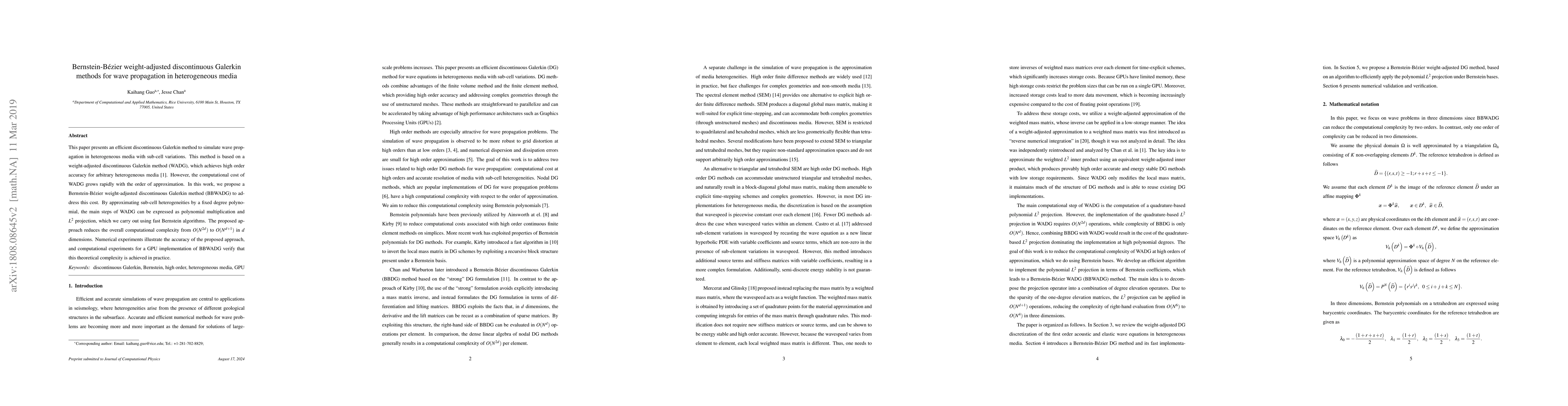 The paper introduces an efficient Bernstein-Bezier weight-adjusted discontinuous Galerkin method (BBWADG) for wave propagation simulations in heterogeneous media, featuring reduced computational complexity and the use of fast Bernstein algorithms for polynomial multiplication and L^2 projection.
