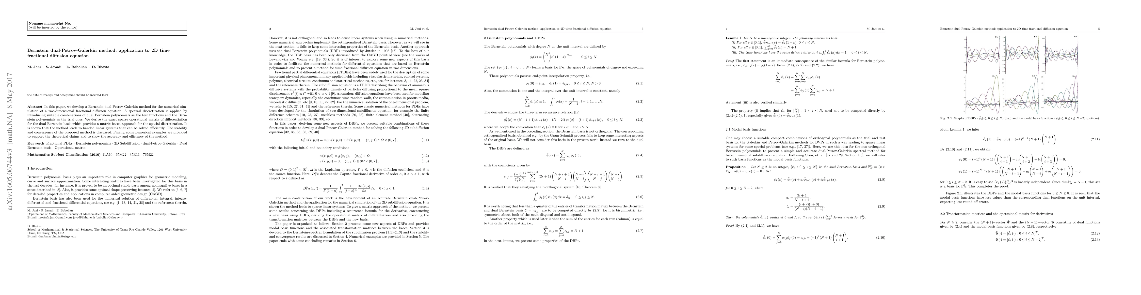 This paper introduces a Bernstein dual-Petrov-Galerkin method for solving a 2D time fractional diffusion equation, employing spectral discretization with dual Bernstein polynomials for test functions and Bernstein polynomials for trial functions. The method results in banded linear systems, ensuring efficient solutions, and demonstrates stability, convergence, and accuracy through numerical examples.