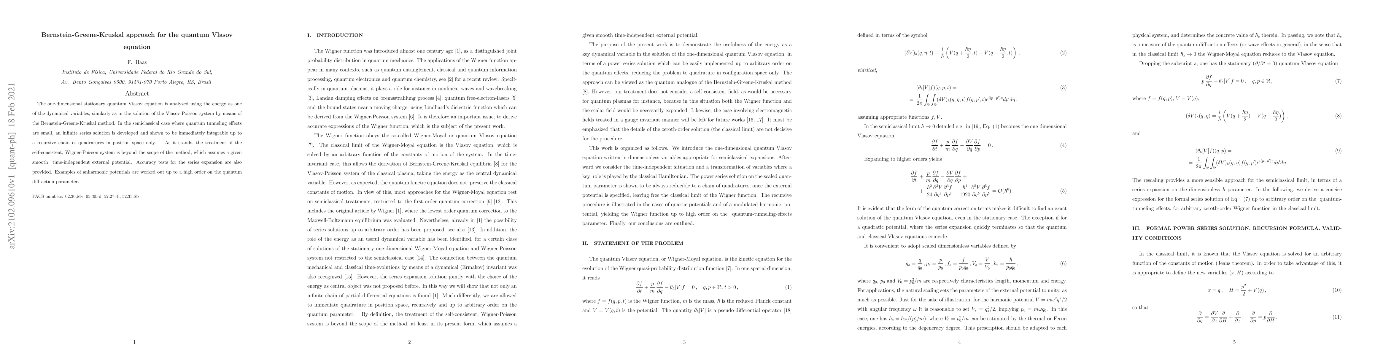 The paper develops an infinite series solution for the one-dimensional stationary quantum Vlasov equation using the Bernstein-Greene-Kruskal method, showing it to be integrable via a recursive chain of quadratures. The method is tested for accuracy in the semiclassical case and applied to anharmonic potentials.