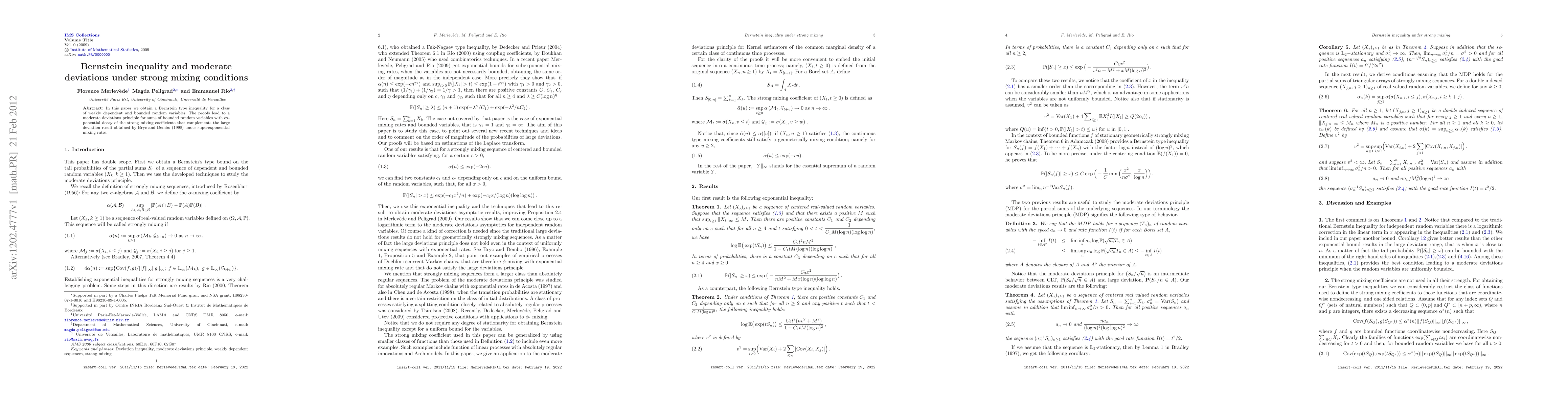 Summary: This paper establishes a Bernstein inequality for weakly dependent, bounded random variables and derives a moderate deviations principle for their sums under strong mixing conditions, extending the large deviation results of Bryc and Dembo (1998) for superexponential mixing rates.