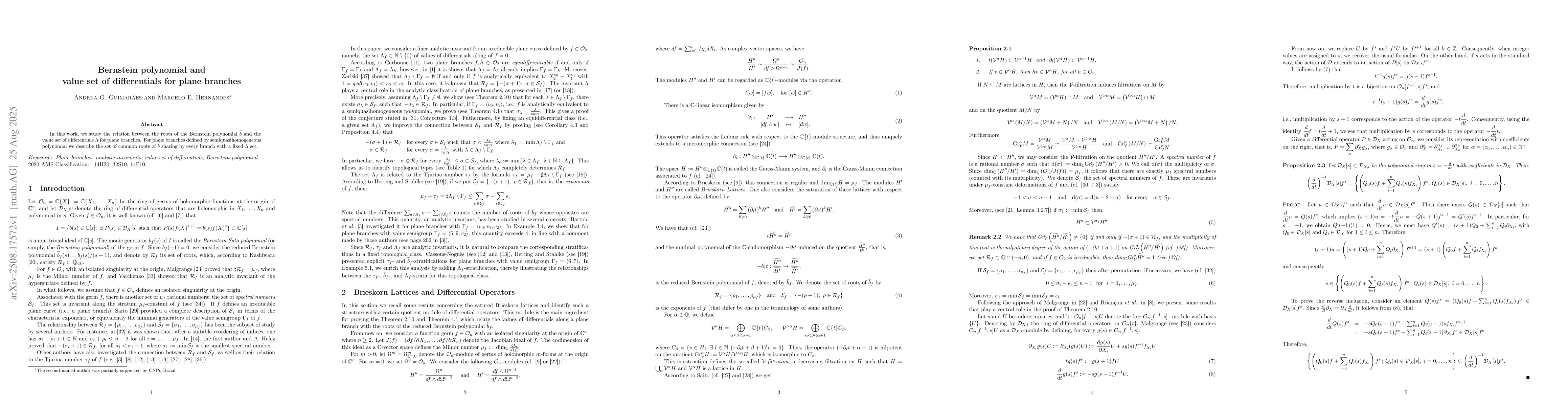 In this work, we study the relation between the roots of the Bernstein polynomial $\widetilde{b}$ and the value set of differentials $\Lambda$ for plane branches. For plane branches defined by semiquasihomogeneous polynomial we describe the set of common roots of $\widetilde{b}$ sharing by every branch with a fixed $\Lambda$ set.