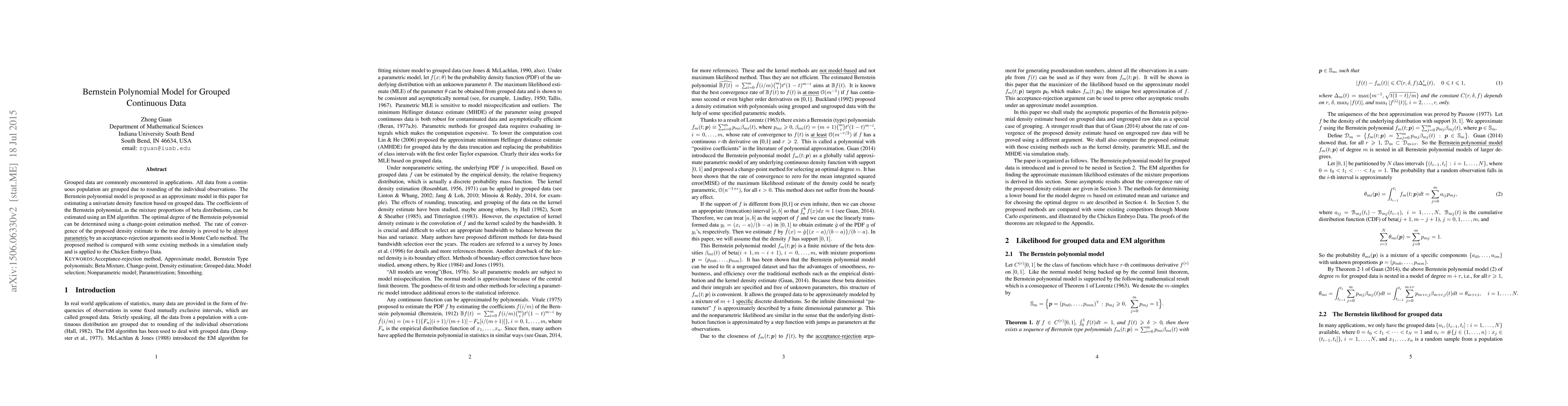 This paper proposes a Bernstein polynomial model for estimating univariate density functions from grouped continuous data, utilizing an EM algorithm for coefficient estimation and a change-point method for determining the optimal polynomial degree. The method's convergence rate is proven, and its performance is compared with existing methods in simulations and applied to a real dataset.