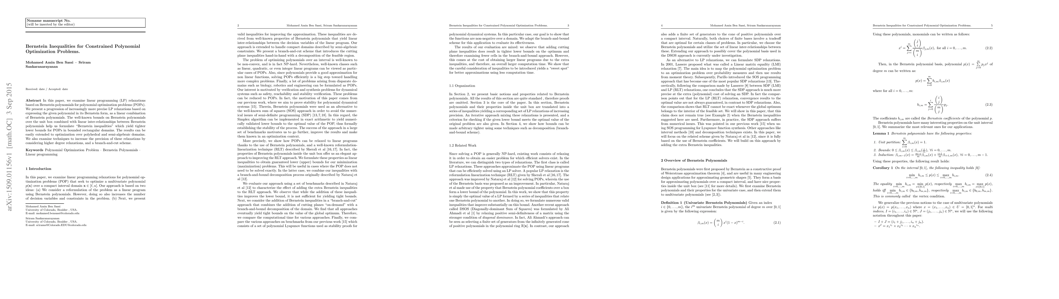 This paper explores Bernstein polynomial-based linear programming relaxations for polynomial optimization problems, leveraging Bernstein inequalities for tighter bounds within bounded domains. Techniques for enhancing precision through higher degree relaxations and a branch-and-cut scheme are also discussed.