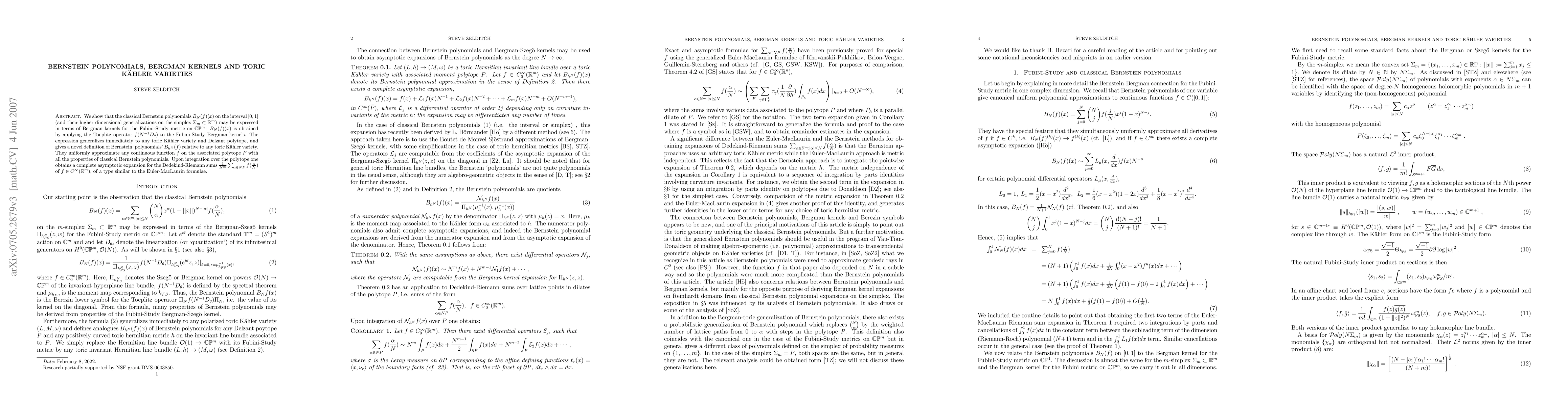 It does not seem to have been observed previously that the classical Bernstein polynomials $B_N(f)(x)$ are closely related to the Bergman-Szego kernels $\Pi_N$ for the Fubini-Study metric on $\CP^1$: $B_N(f)(x)$ is the Berezin symbol of the Toeplitz operator $\Pi_N f(N^{-1} D_{\theta})$. The relation suggests a generalization of Bernstein polynomials to any toric Kahler variety and Delzant polytope $P$. When $f$ is smooth, $B_N(f)(x)$ admits a complete asymptotic expansion. Integrating it over $P$ gives a complete asymptotic expansion for Dedekind-Riemann sums of smooth functions over lattice points in $N P$ related to Euler-MacLaurin sum formulae of Guillemin-Sternberg and others.