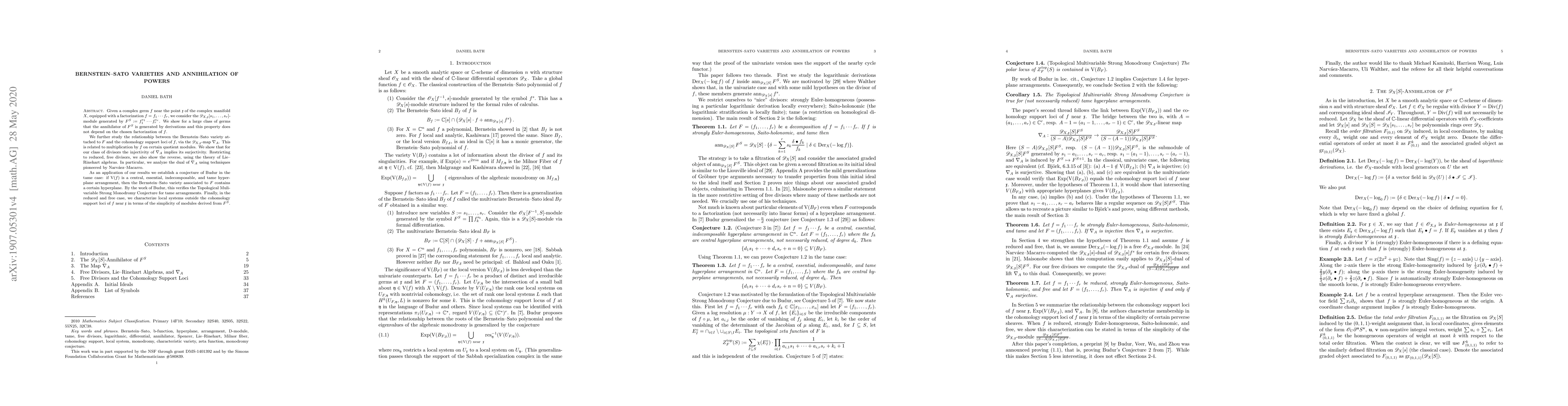 This paper investigates the annihilators of powers of a complex germ $f$ and demonstrates their generation by derivations, independent of the factorization of $f$. It explores the connection between Bernstein-Sato varieties and cohomology support loci, proving that injectivity of a certain $\mathscr{D}$-map implies surjectivity for a class of divisors. It verifies Budur's conjecture for tame hyperplane arrangements and characterizes local systems outside the cohomology support loci using derived module simplicity.