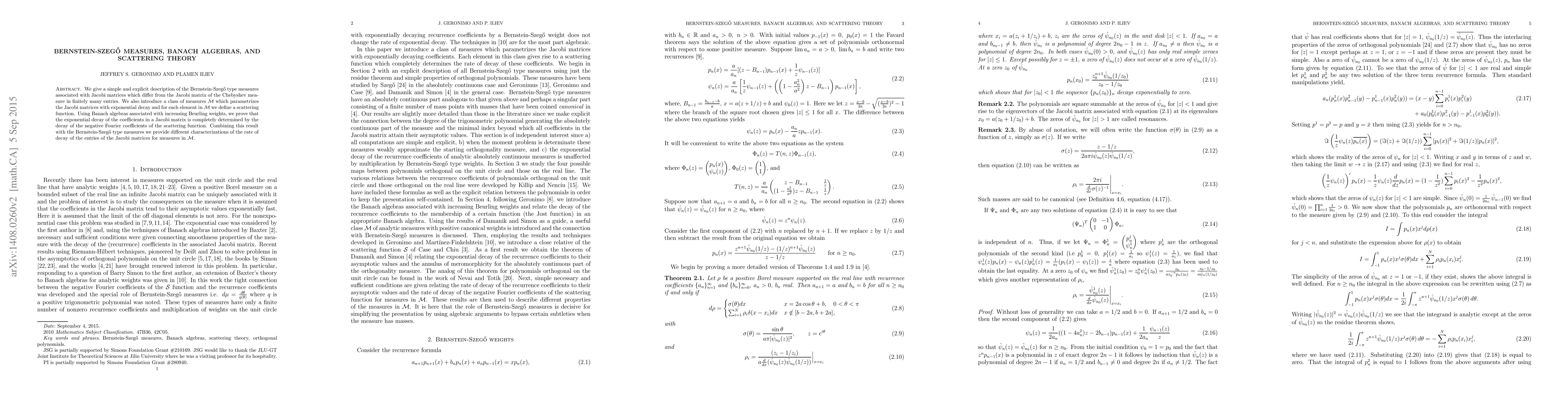 We give a simple and explicit description of the Bernstein-Szego type measures associated with Jacobi matrices which differ from the Jacobi matrix of the Chebyshev measure in finitely many entries. We also introduce a class of measures M which parametrizes the Jacobi matrices with exponential decay and for each element in M we define a scattering function. Using Banach algebras associated with increasing Beurling weights, we prove that the exponential decay of the coefficients in a Jacobi matrix is completely determined by the decay of the negative Fourier coefficients of the scattering function. Combining this result with the Bernstein-Szego type measures we provide different characterizations of the rate of decay of the entries of the Jacobi matrices for measures in M.