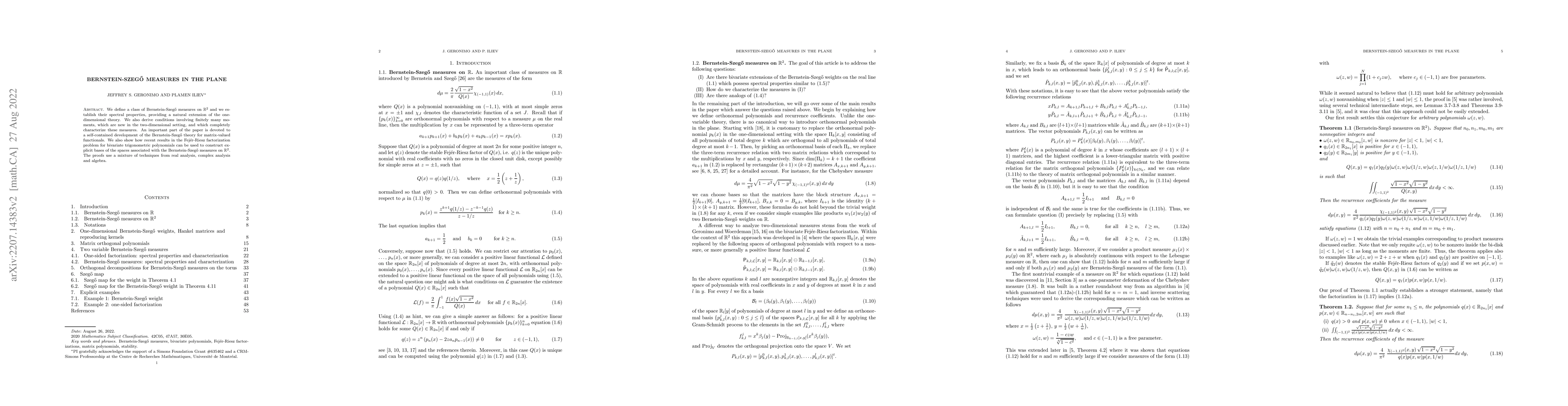 This paper introduces Bernstein-Szegő measures in the plane, extending the one-dimensional theory, and establishes their spectral properties. It also characterizes these measures through conditions involving finitely many moments, and utilizes Fejér-Riesz factorization results to construct explicit bases for associated function spaces.