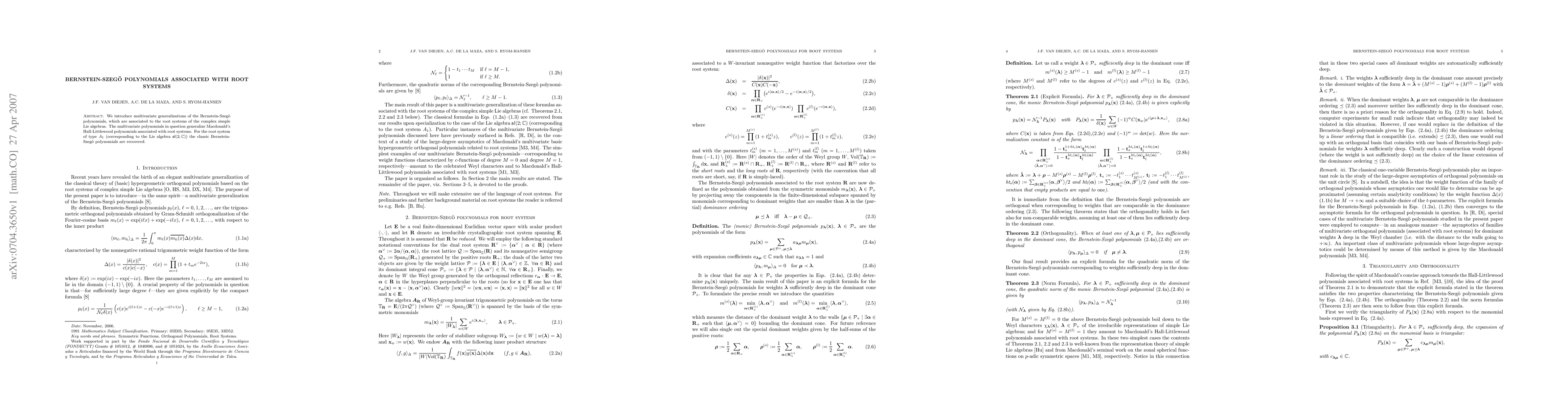 This paper generalizes Bernstein-Szego polynomials to multivariate forms linked with the root systems of complex simple Lie algebras, specifically extending Macdonald's Hall-Littlewood polynomials. The classic Bernstein-Szego polynomials are retrieved for the root system of type A1 (SL(2;C)).