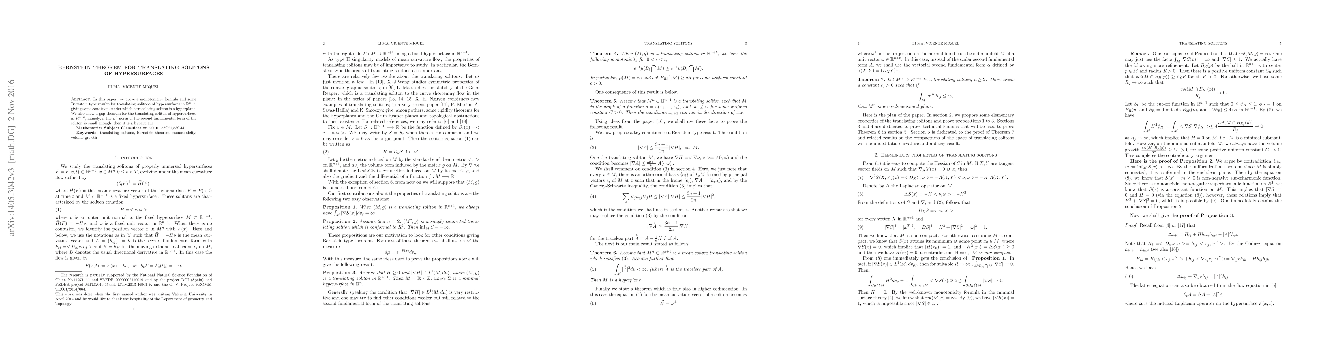This paper presents a proof of a monotonicity formula and Bernstein-type results for translating solitons of hypersurfaces in $ e^{n+1}$, identifying conditions under which these solitons are hyperplanes. It also establishes a gap theorem for translating solitons in $R^{n+k}$, stating that if the $L^n$ norm of the second fundamental form is sufficiently small, the soliton must be a hyperplane.