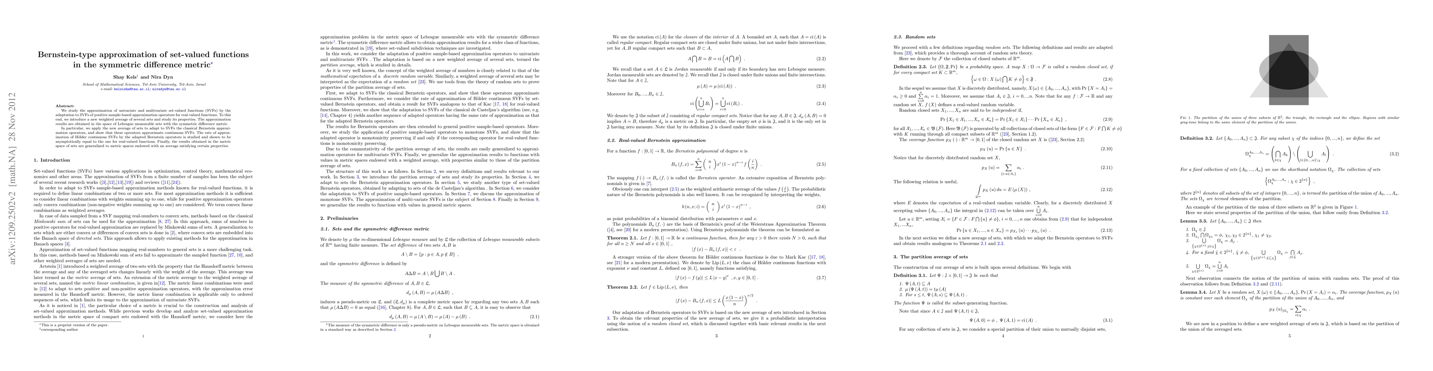 We study the approximation of univariate and multivariate set-valued functions (SVFs) by the adaptation to SVFs of positive samples-based approximation operators for real-valued functions. To this end, we introduce a new weighted average of several sets and study its properties. The approximation results are obtained in the space of Lebesgue measurable sets with the symmetric difference metric. In particular, we apply the new average of sets to adapt to SVFs the classical Bernstein approximation operators, and obtain a set-valued analog of the Weierstrass approximation theorem. The rate of approximation of H\"older continuous SVFs by Bernstein operators is studied and shown to be asymptotically equal to that for real-valued functions. Finally, the results obtained in the metric space of sets are generalized to metric spaces endowed with an average satisfying certain properties.