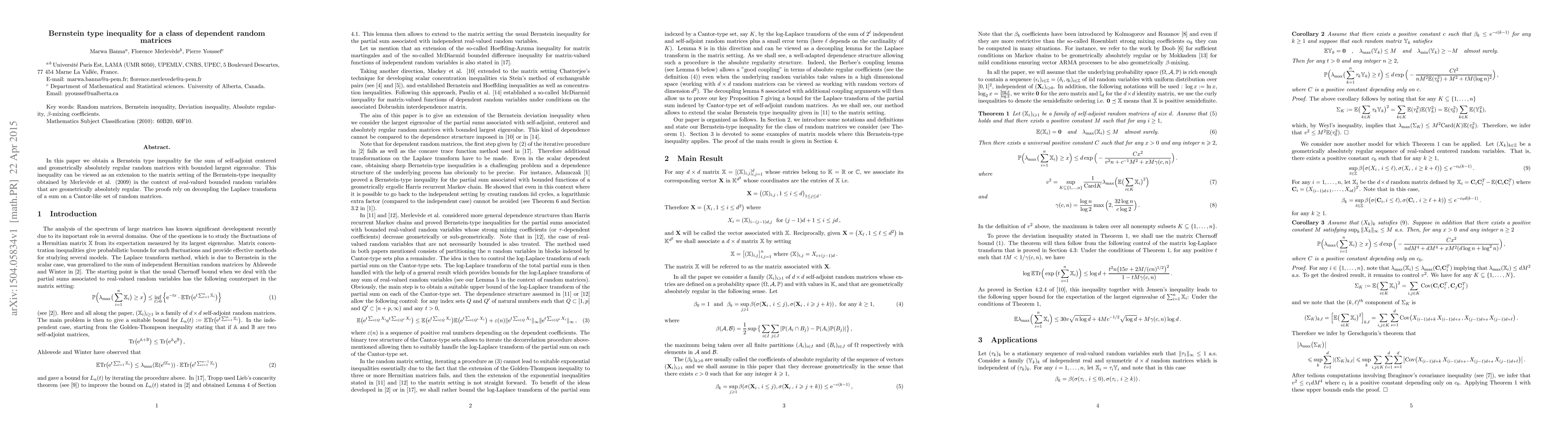 This paper establishes a Bernstein-type inequality for self-adjoint, centered, and geometrically absolutely regular random matrices with bounded largest eigenvalues, extending the results from real-valued random variables to the matrix setting. The proofs utilize decoupling techniques on a Cantor-like set of matrices.