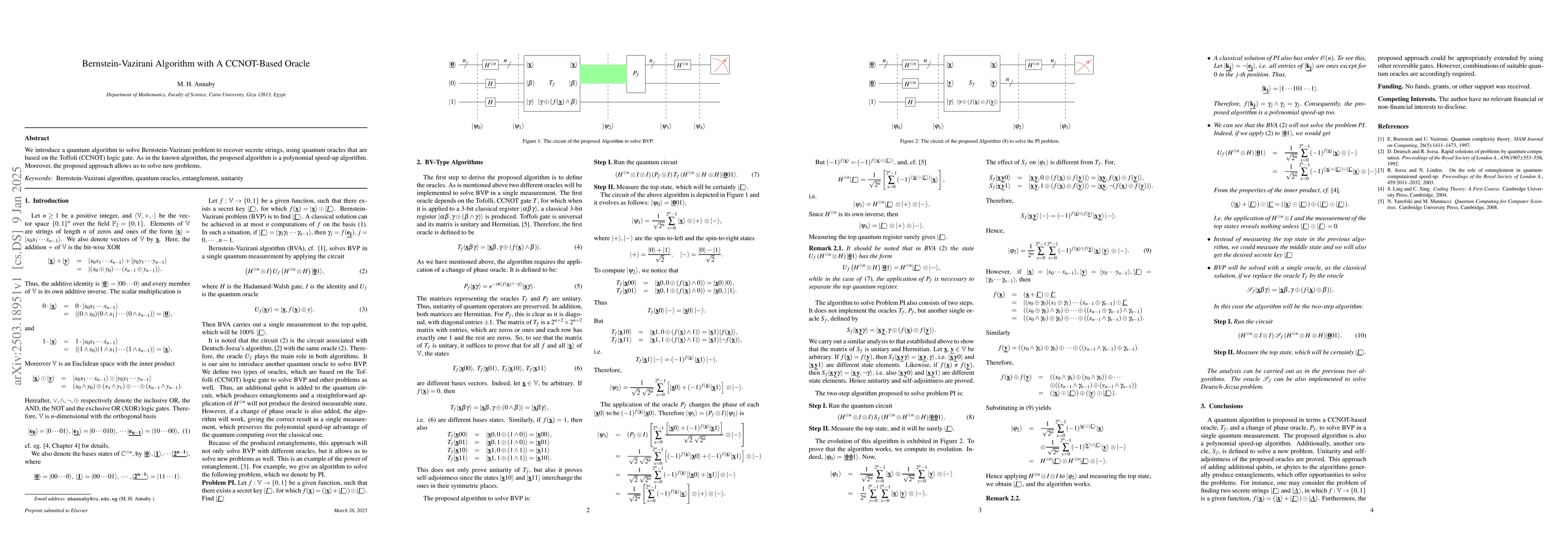 Summary: This paper presents a quantum algorithm for the Bernstein-Vazirani problem using a Toffoli gate-based oracle, achieving polynomial speed-up and enabling solutions to new problems beyond the original algorithm.