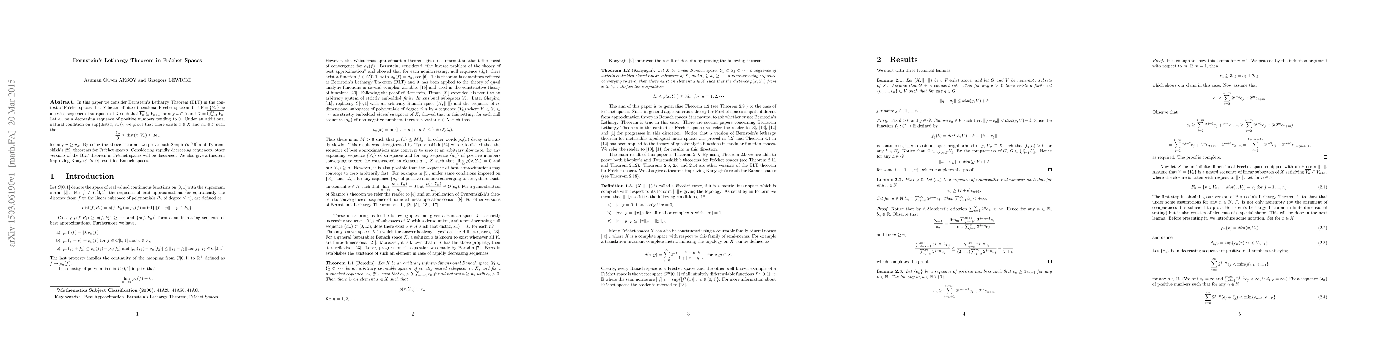 This paper extends Bernstein's Lethargy Theorem to infinite-dimensional Fréchet spaces, proving the existence of a point with specific distance properties relative to nested subspaces. The authors also demonstrate the implications of this theorem for Shapiro's and Tyuremskikh's theorems in Fréchet spaces.