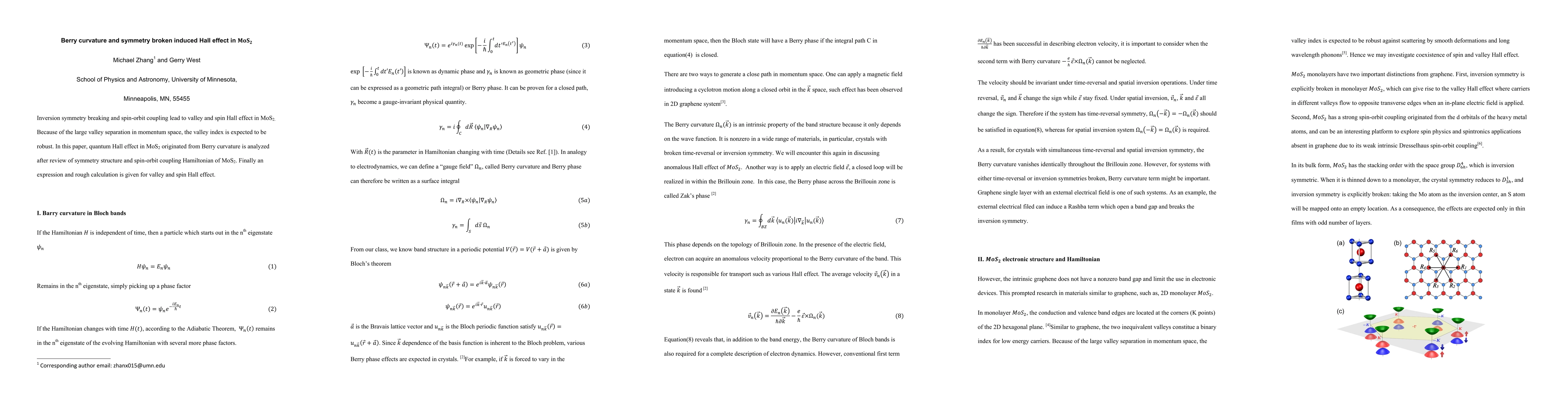 This paper investigates the quantum Hall effect in MoS2 driven by Berry curvature due to inversion symmetry breaking and spin-orbit coupling, leading to robust valley and spin Hall effects. An expression for the valley and spin Hall effect is derived and roughly calculated.