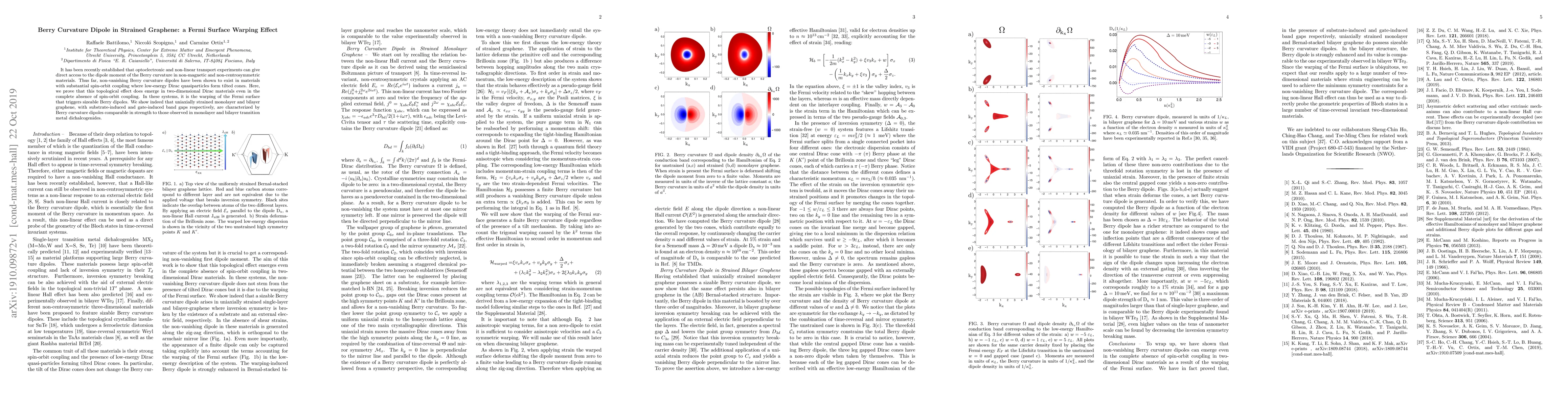 This paper demonstrates that the Berry curvature dipole, a topological effect, can emerge in strained graphene even without spin-orbit coupling, due to Fermi surface warping. Uniaxially strained graphene exhibits Berry curvature dipoles comparable to those found in transition metal dichalcogenides, highlighting the effect's presence in two-dimensional Dirac materials.